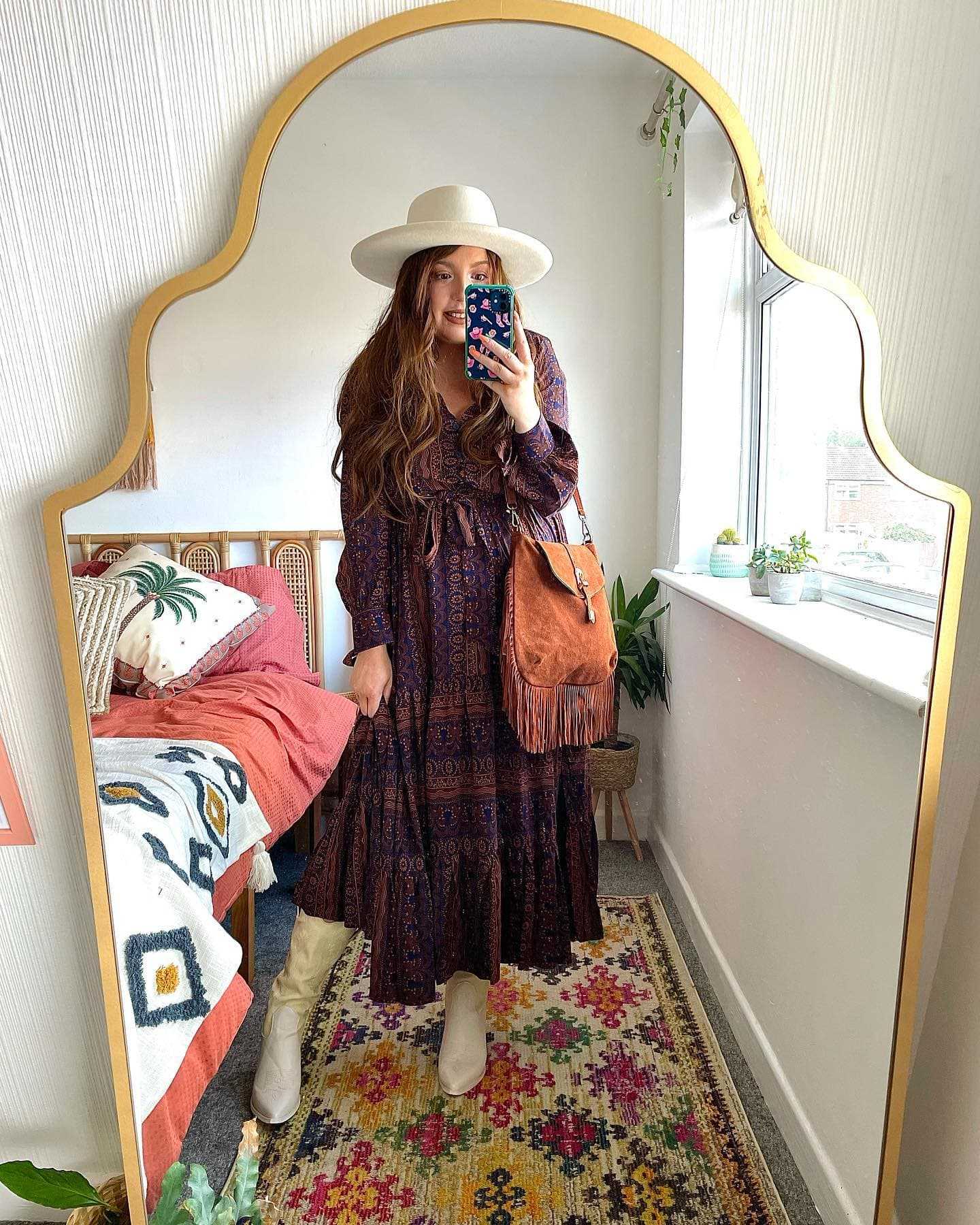 - Широкая легкая юбка до колена сочного цвета, корсетный топ, высокие ботинки. В дополнение можно добавить жилетку и рюкзак, а еще шляпку.