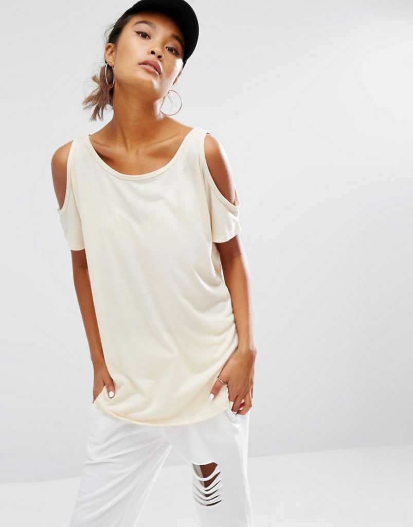 Создавая свой комплект, не стоит копировать подругу или популярную певицу. Слепое копирование приведет только к обратному результату. Необходимо найти свой стиль: неповторимый и оригинальный. Помогут футболки с открытым плечом. Это отличный выбор.