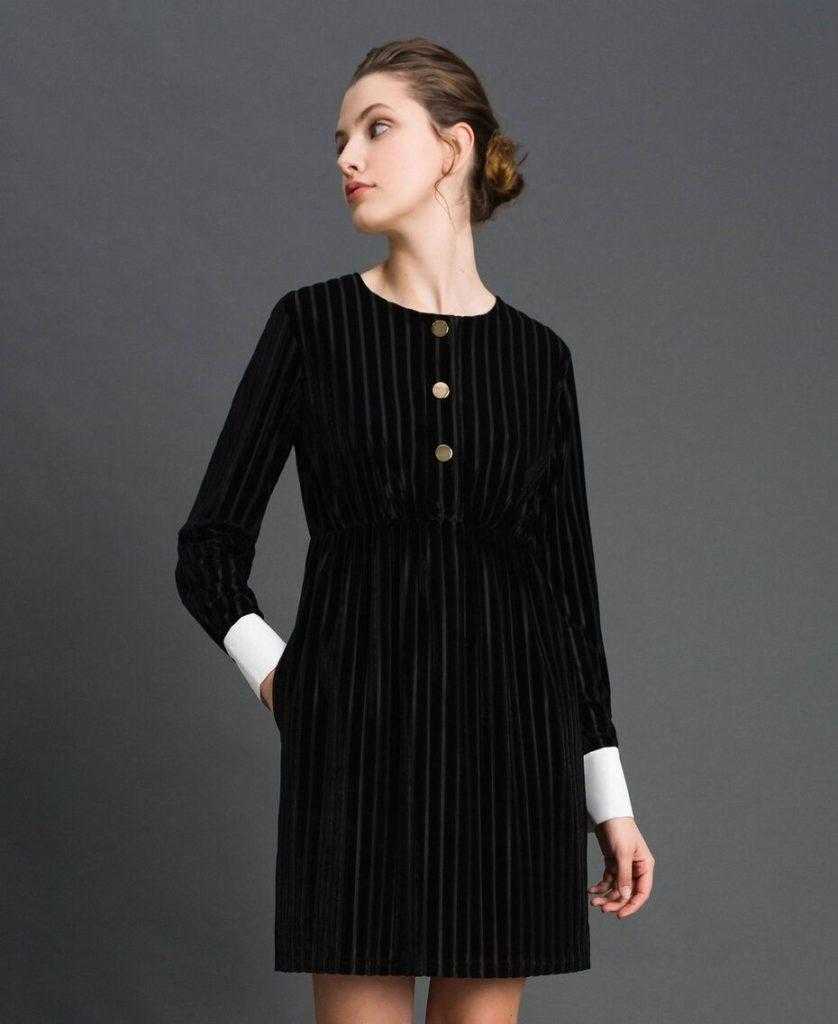 Наряд сшитый из бархата смотрится дорого и изыскано. А чёрное платье выполнение из такого материала будет обладать особым шиком. Но стоит заметить, что бархат слегка блестит, поэтому может визуально придать ненужного объема пышным формам. Поэтому крупным женщинам стоит отказаться от таких платьев. Идеальным дополнением к бархатному платью будут аккуратные жемчужные украшения.