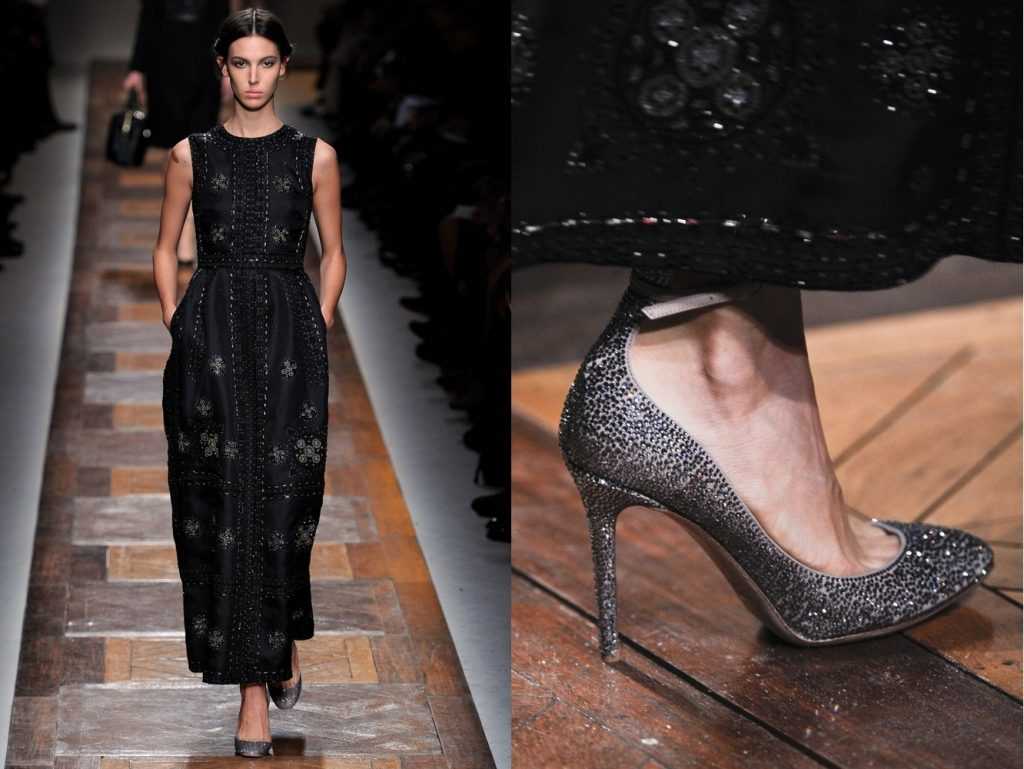 Изящные каблуки и дорогие материалы – варианты обуви для одежды в пол.