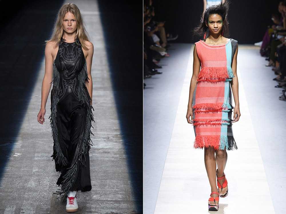 Довольно интересные платья с декором на юбке – отличное решение, если вы хотите визуально скорректировать свою фигуру. Выбирайте изделие с короткой бахромой в том случае, если нужно добавить немного объема в зоне бедер. Если же основная задача – удлинить силуэт и сделать фигуру более стройной, то присмотритесь к платьям с длинной бахромой.