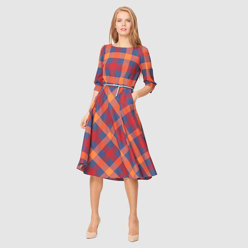 Школьницы и бизнес-вумен носят платья а-силуэта в клетку, полоску, с контрастными пуговицами и поясами, которые не выбиваются за рамки делового дресс-кода, но выглядят интереснее однотонных моделей.