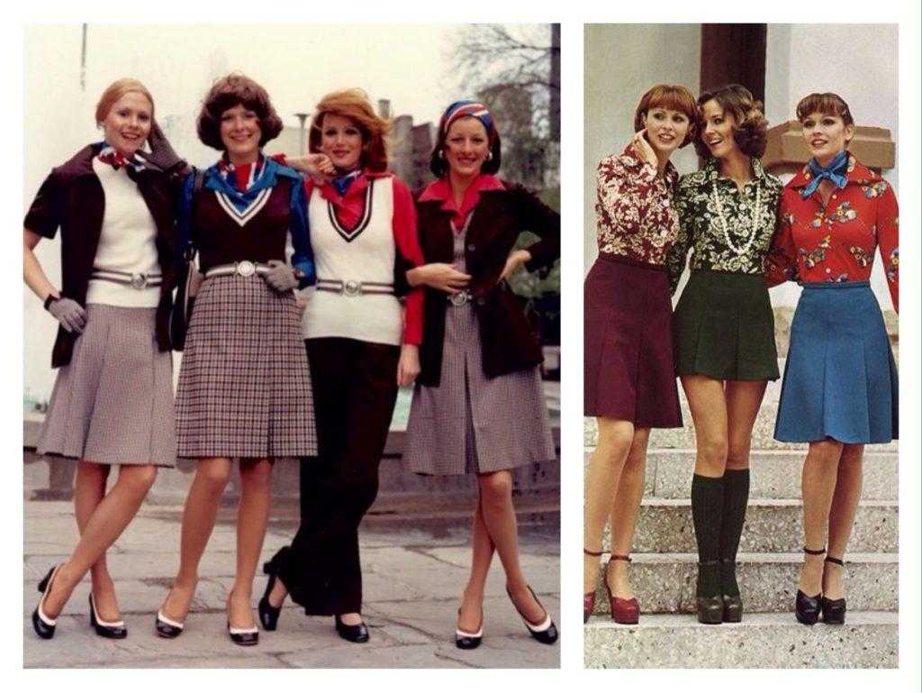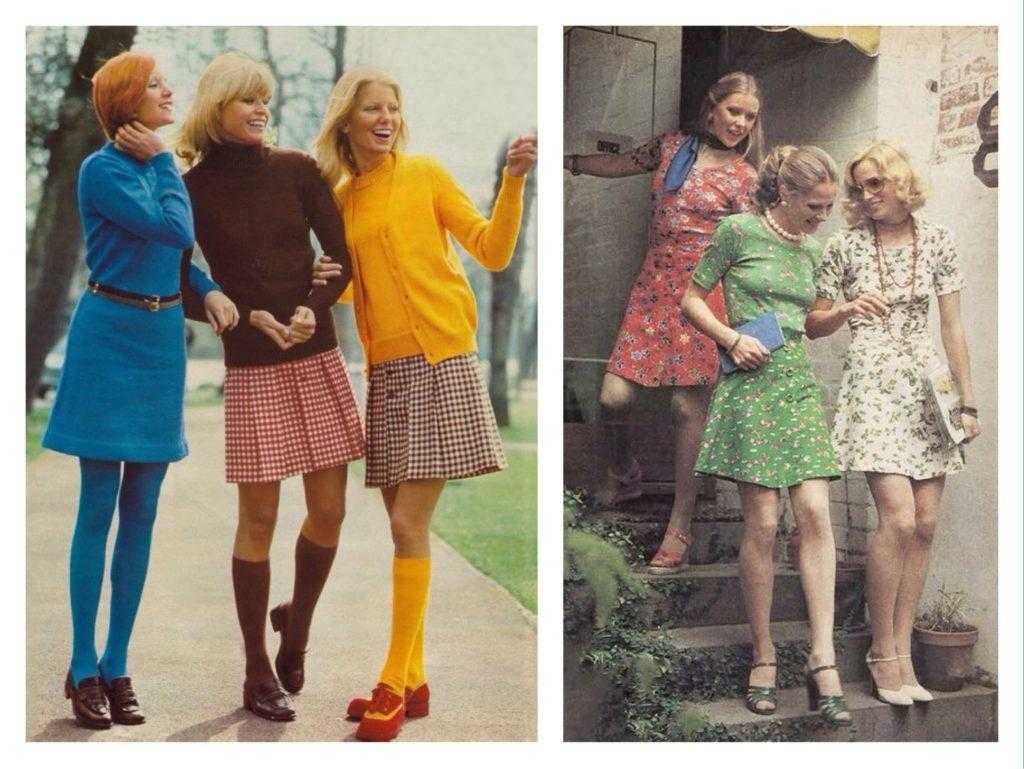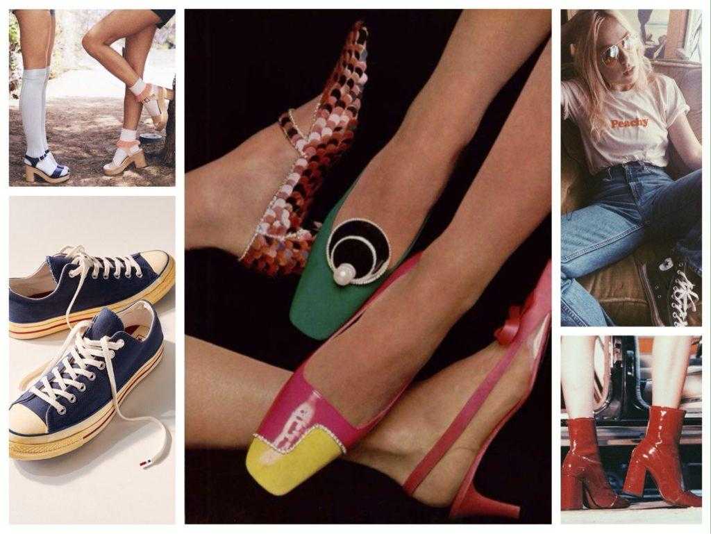 Платье носили вместе с тонким поясом и ожерельем. В это время популярными становятся массивный каблук, платформа и танкетка, которые не утратили актуальности и в наших дни.