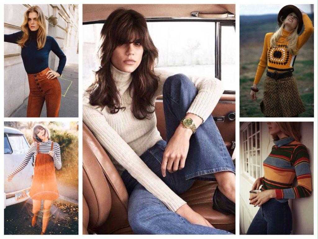Культовой вещью в это время становится тонкий свитер, дополненный воротником-стойкой, который известен, как водолазка. Их надевали под платья и рубашки, комбинировали с костюмами, брюками, сарафанами, комбинезонами, юбками. Многослойность в 70-х стала невероятно популярной и удачно вписалась в популярный тогда этнический стиль.