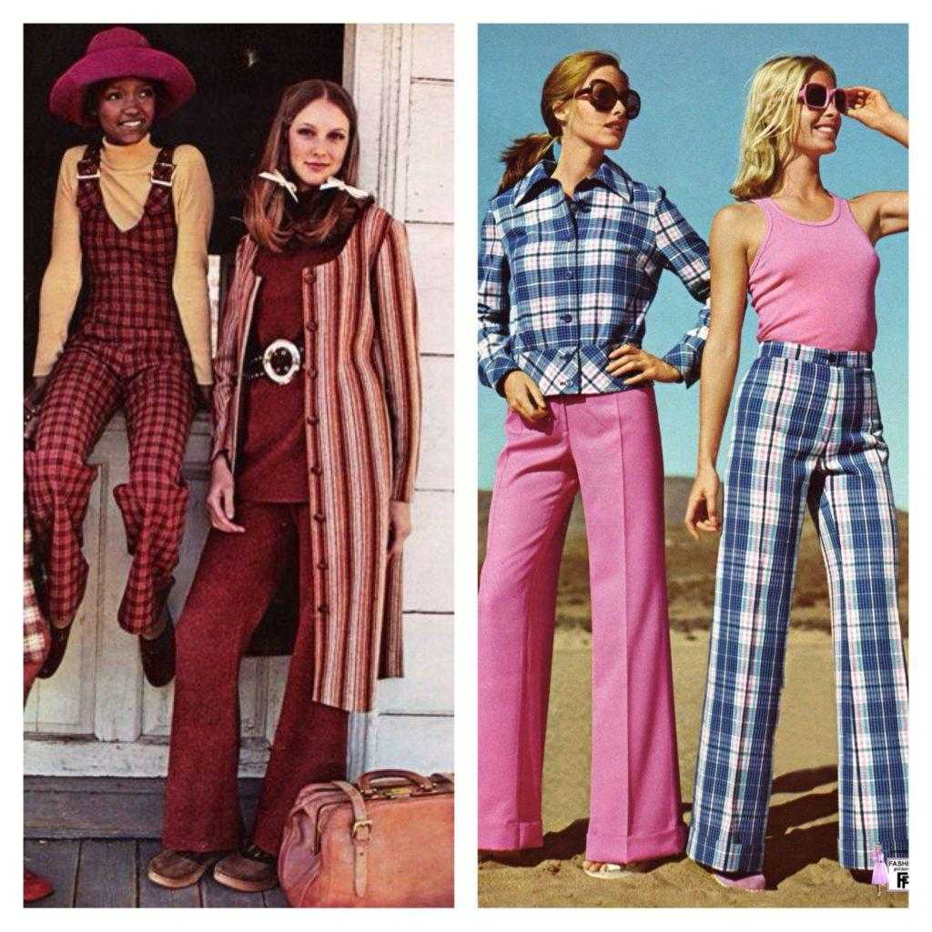 Цветовая палитра и актуальные принты сегодняшних коллекций – это современная версия идей из 70-х годов. Абстрактные рисунки в сложных цветовых сочетаниях, яркая крупная «клетка» а так же восточные узоры и орнаменты впервые появились на подиумах именно в это десятилетие.