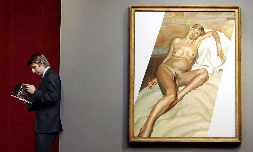 Мэтью Патон из Christies стоит рядом с портретом обнаженной британской модели Кейт Мосс работы Люсьена Фрейда под названием «Naked Portrait 2002» в Лондоне, октябрь 2004 г.
