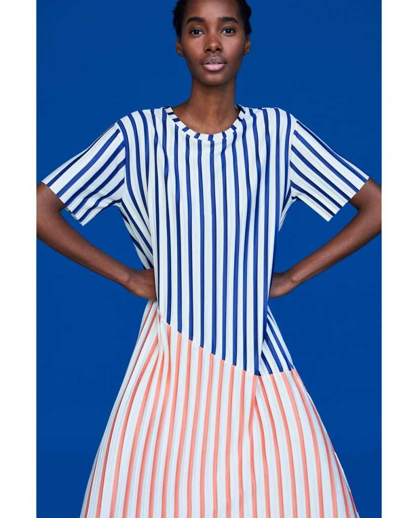 - В полоску. Полоска всегда в моде. Черно-белые или цветные полосы как атрибут морского стиля хорошо смотрятся со шляпой, наплечной сумкой, сандалиями на танкетке, шлепанцами или белыми кроссовками.