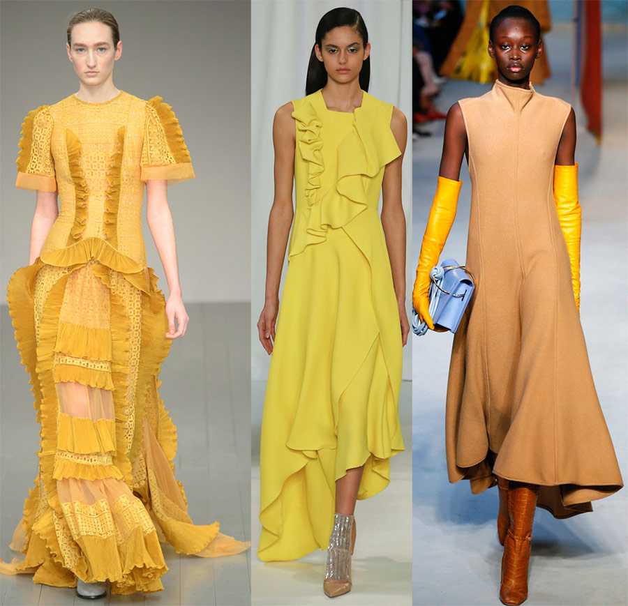 наиболее разнообразно проявила себя в новом сезоне. Здесь великолепие лимонных и апельсиновых оттенков, цвет верблюжьей шерсти и небольшого зверька из мангустовых – суриката, горчичные и коричневые тона, цвет опавшей листвы и сливочный, цвет софитов и шартреза.