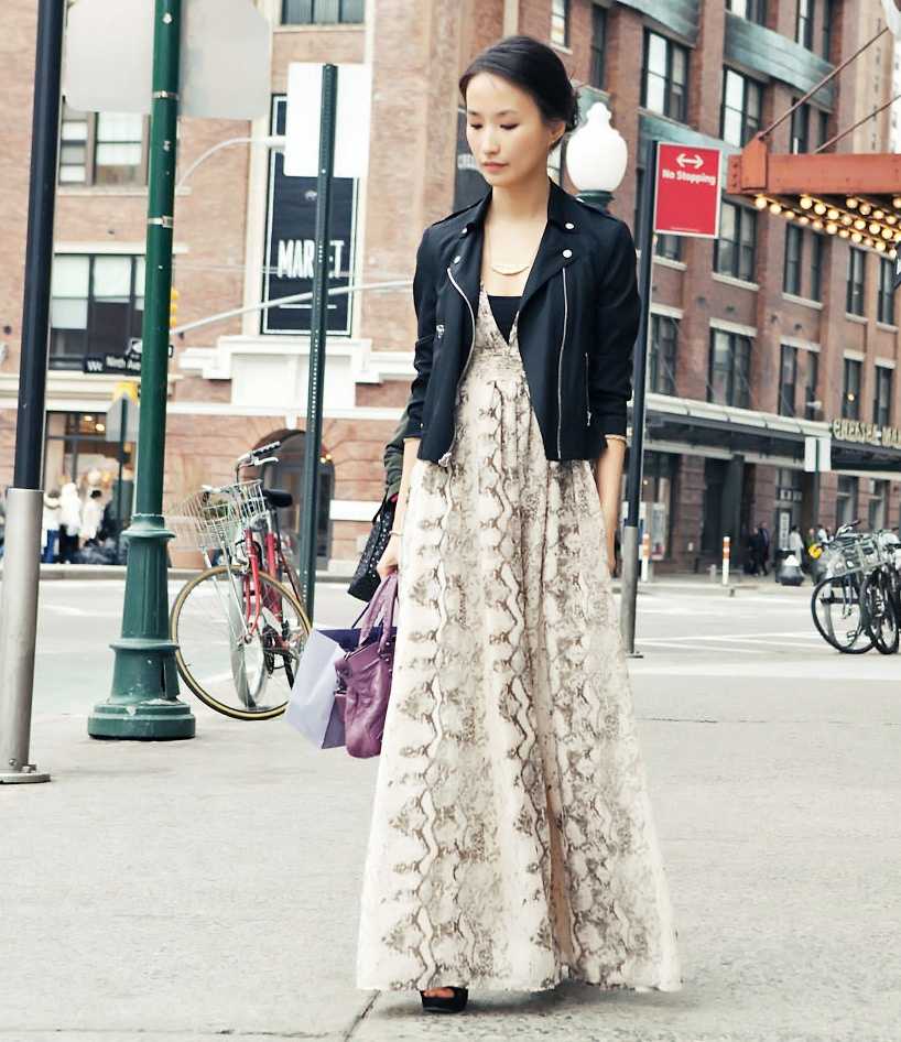 Если вы являетесь поклонницей стиля «гранж», то можете смело сверху на длинное платье надевать кожаную куртку. Это может быть, укороченный вариант куртки или косуха пастельных оттенков (розового, голубого, кремового) с длинным романтичным платьем. Дополнят образ сапоги на каблуке.