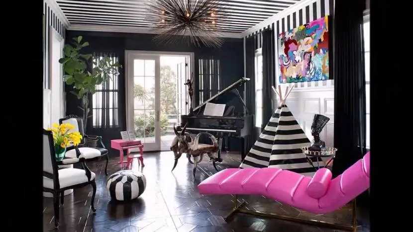 - Яркие, сочные, кислотные цвета в самых смелых комбинациях – фиолетовый с зеленым, красный с бирюзовым. Не чужды интерьерам в стиле поп и сочетания черного и белого в необычных фактурах.