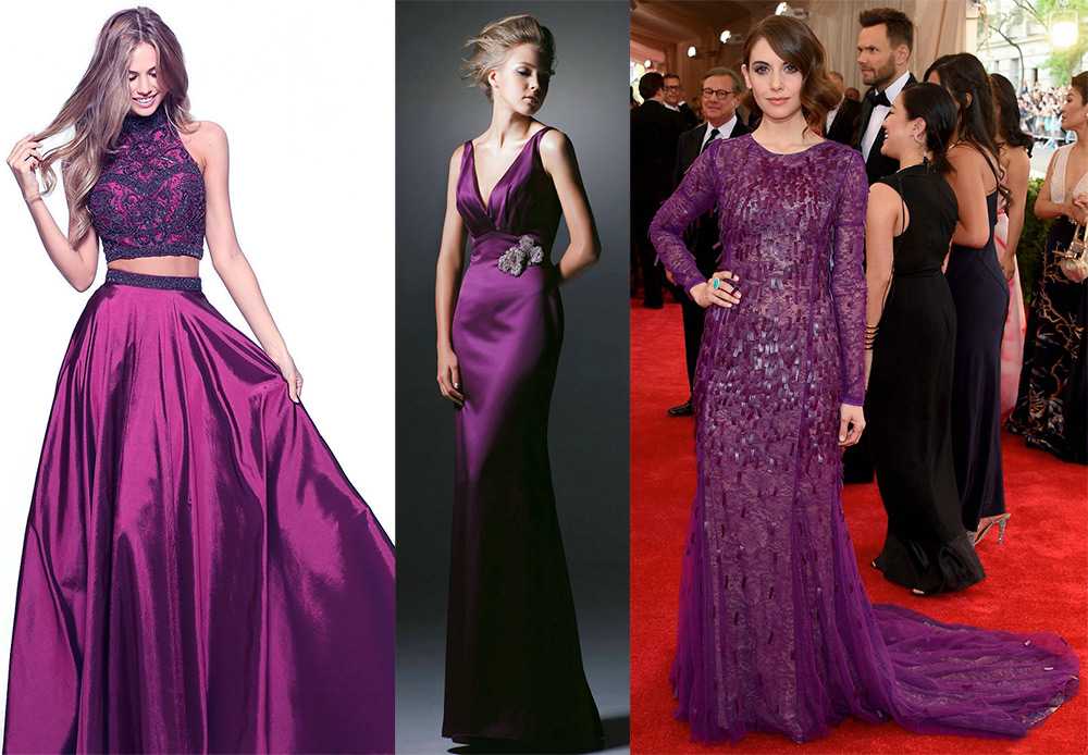 Заставляет цвет играть и переливаться, притягивает к нему взгляды. Подбирать туфли в тон платью совсем не обязательно, они могут быть контрастного цвета. Платье пурпурного цвета наравне с черным лидирует в вечерних нарядах.