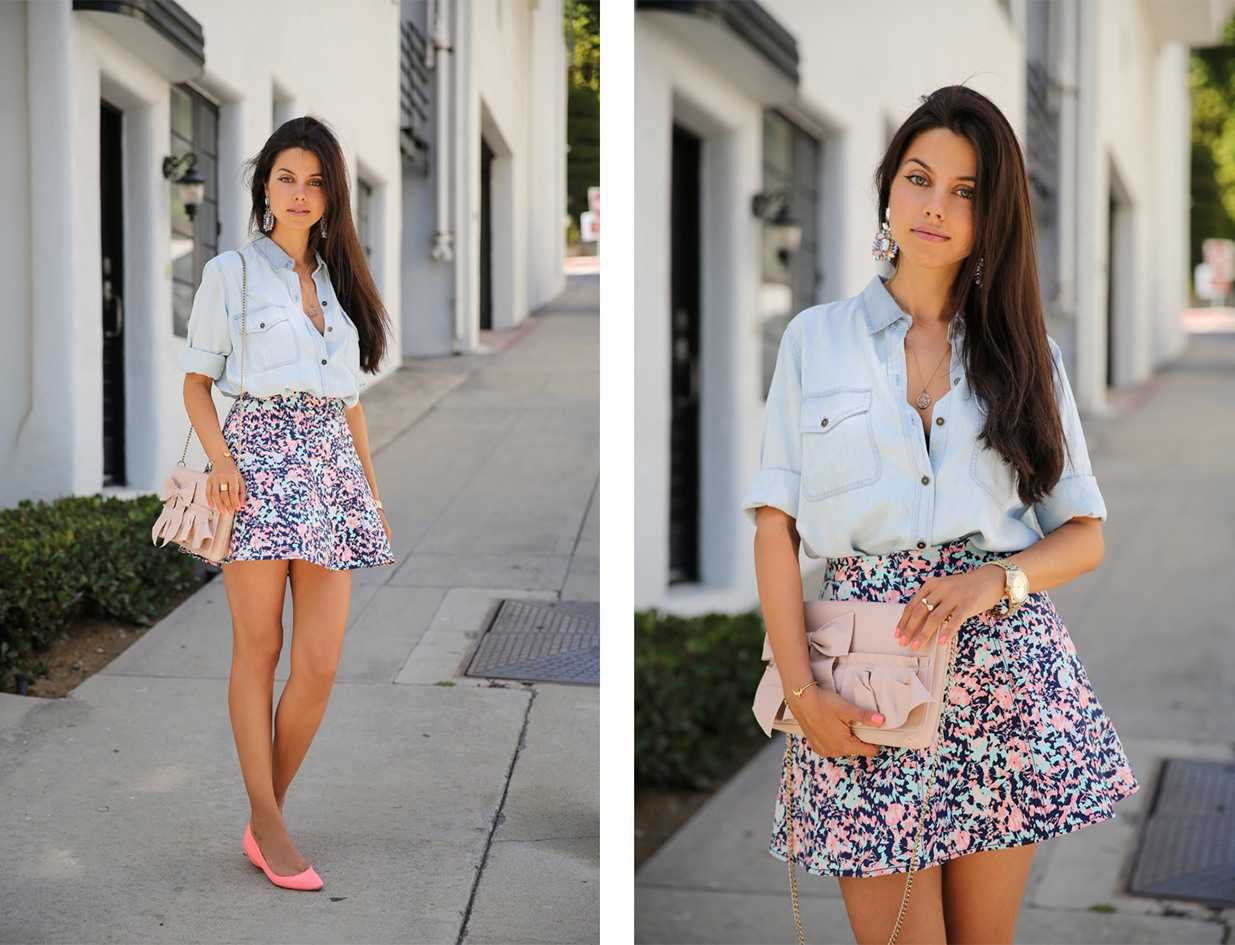 - Такая рубашка отлично сочетается с короткими юбками из разных тканей. Если вы обладательница стройной фигуры – смело надевайте джинсовую мини-юбку, а сорочку завяжите под грудью. Причем такое сочетание не требует никаких дополняющих аксессуаров — вы и так будете замечательно выглядеть.