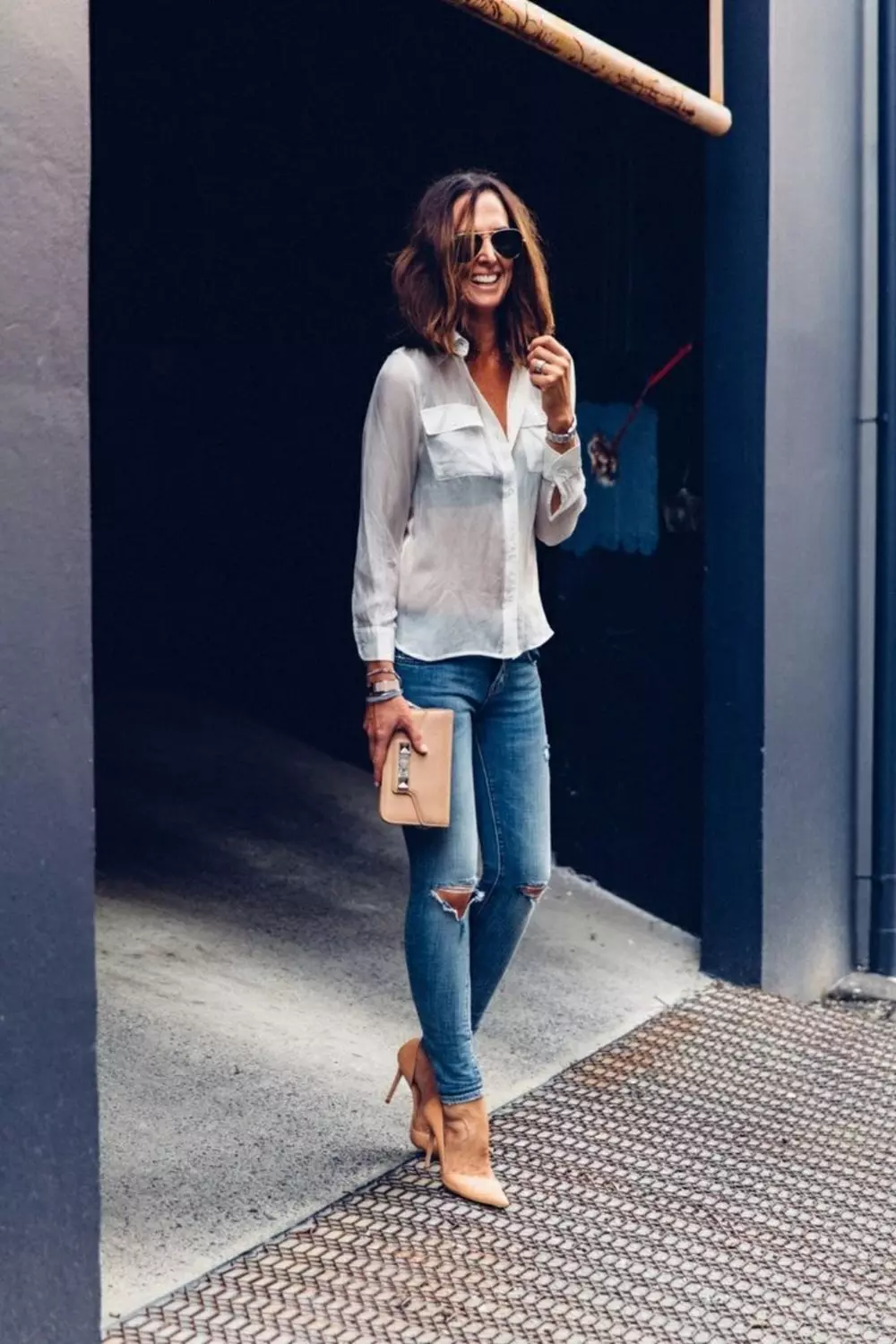 Рваные предметы одежды в классический гардероб как-то не вписываются? А вот и ошибаетесь! Многие знатоки советуют разбавлять строгие классические образы скини с дырками. Деловая леди может отправиться в них в офис. Для этого подойдут изделия с минимальным количеством «недостатков», если дополнит верхом из классической однотонной блузки и жакета. Он впишется на пару с красивыми лодочками и лаконичным клатчем или сумочкой.