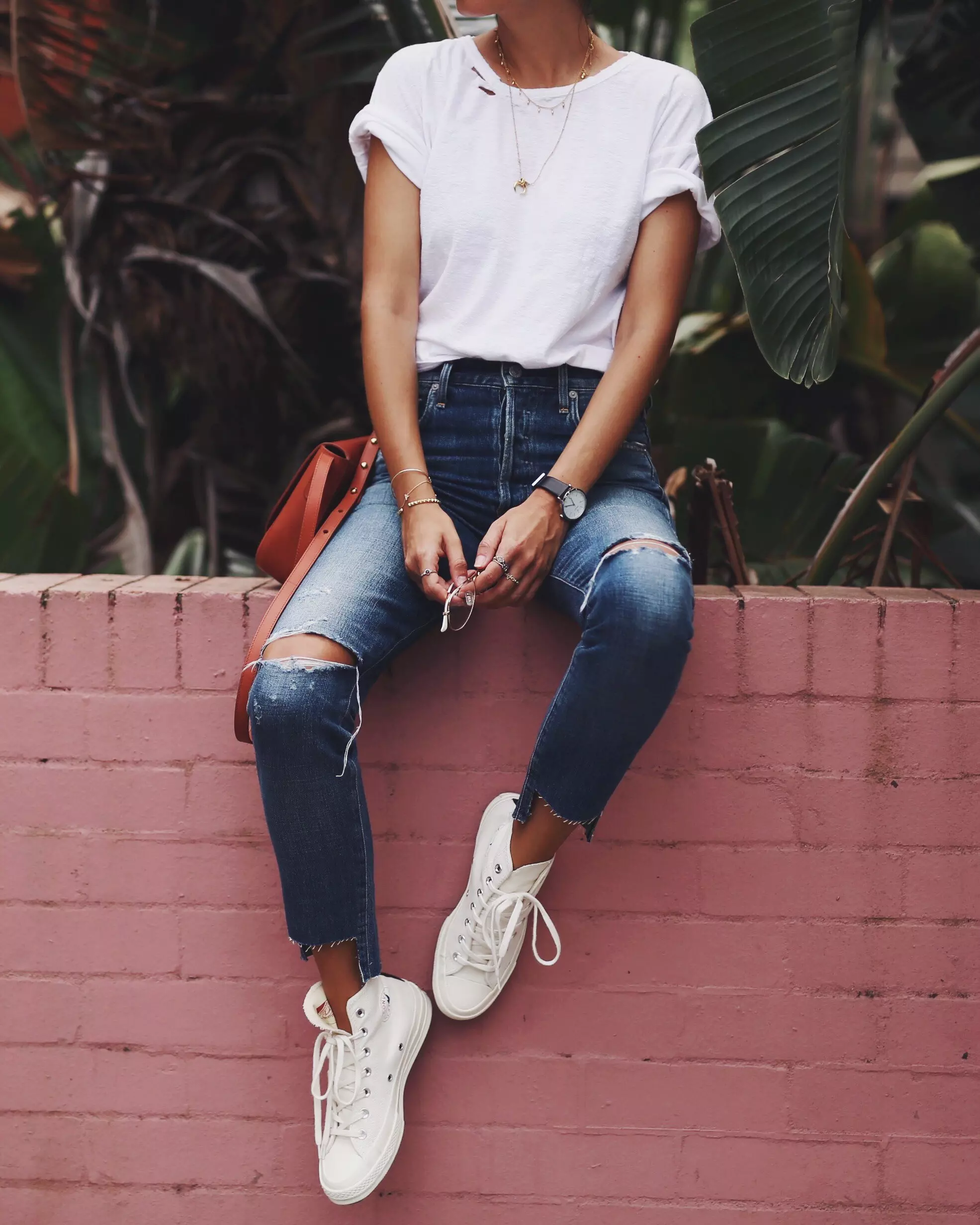 Светлая футболка и бойфренды — просто и всегда трендово.