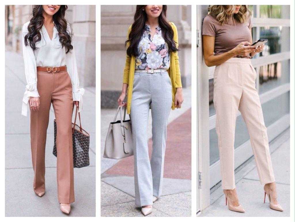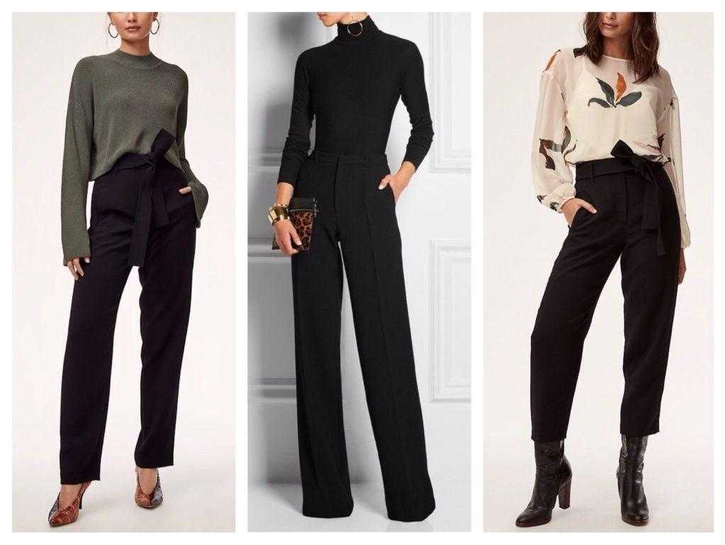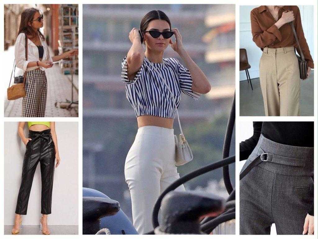 В офисе незаменимыми будут брюки с высокой талией и с поясом. Их носят с блузой, рубашкой или кофтой с баской. На прогулку такой фасон надевают с майкой, заправленной внутрь. Для вечеринки штаны комбинируют с акцентной блузой или топом.