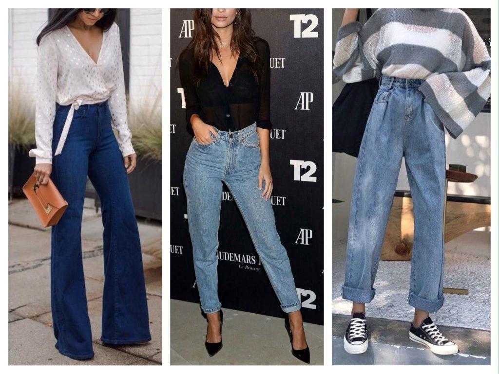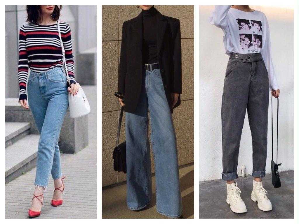 К популярным фасонам высоких джинсовых брюк относят: мам, скинни, слим, прямые и клеш. Их носят с: рубашкой (белой, джинсовой, в клетку), футболкой, блузой, топом. В холодное время года со свитером, водолазкой, джемпером, кардиганом, короткой курткой или пальто.