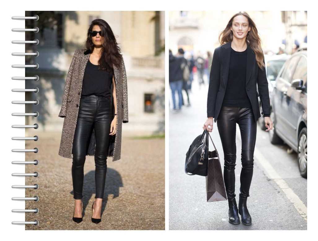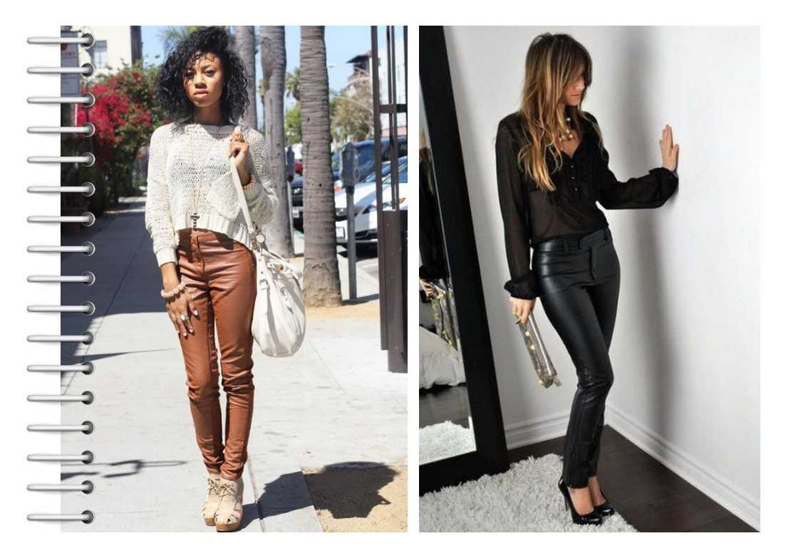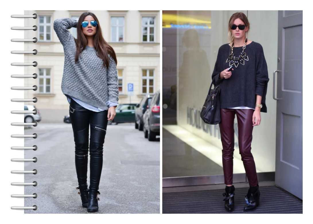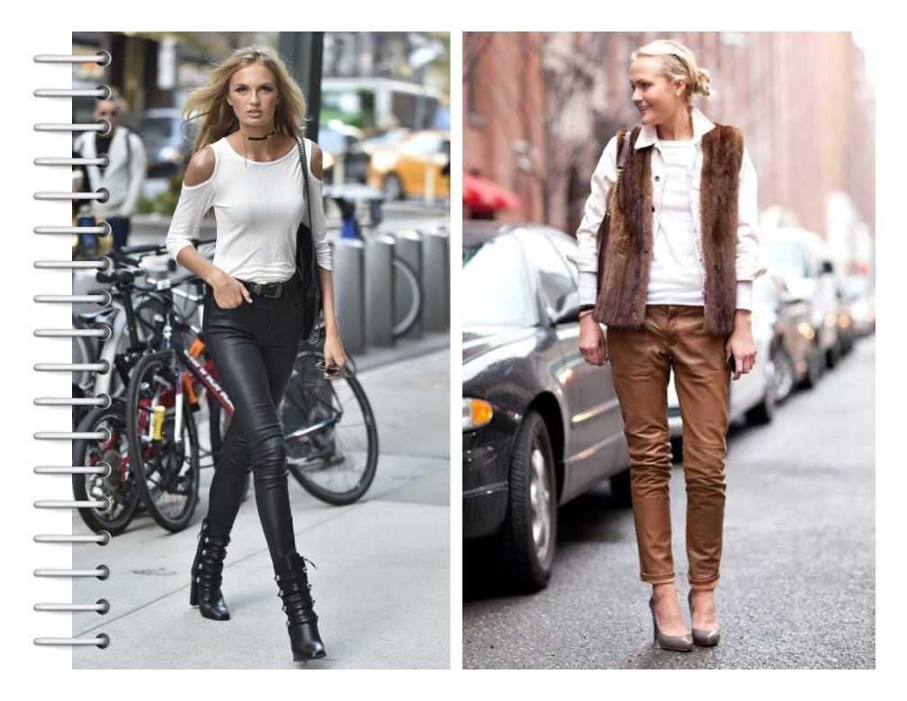 С кожей сочетаются вещи, сшитые из натуральных материалов — шерсти, хлопка и т. п. Неплохо смотрятся с кожей мохеровые вещи. Вязаные также подходят к штанам. Казалось бы, как могут сочетаться кожа с «тяжелыми» материалами? Но практика показывает, что такие варианты очень удачны. Удачные сочетания Лучше не экспериментировать и носить кожаные штаны с классическими вещами. Например, с белой блузкой, футболкой.