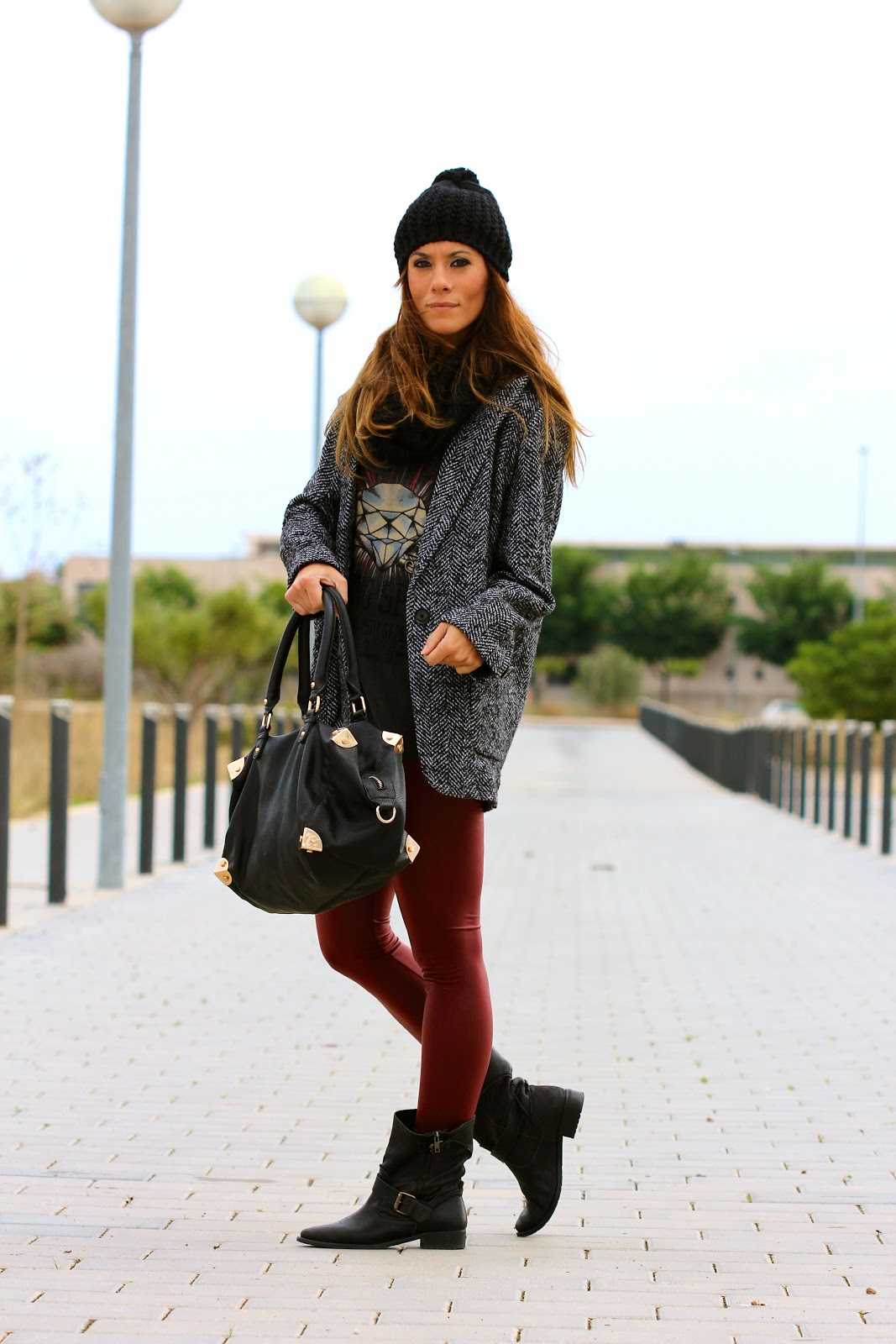 Компаньоном кожаных лосин станет объемный удлиненный свитер либо свитшот. Цвета лучше выбирать темные: черный, вишневый, коричневый. Трикотажные вставки будут удачным дополнением.