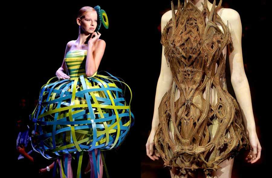- Наряд из битого фарфора. Для китайского художника оказалось немыслимым выбросить осколки посуды из фарфора, поэтому он оклеил ими кожаную основу.