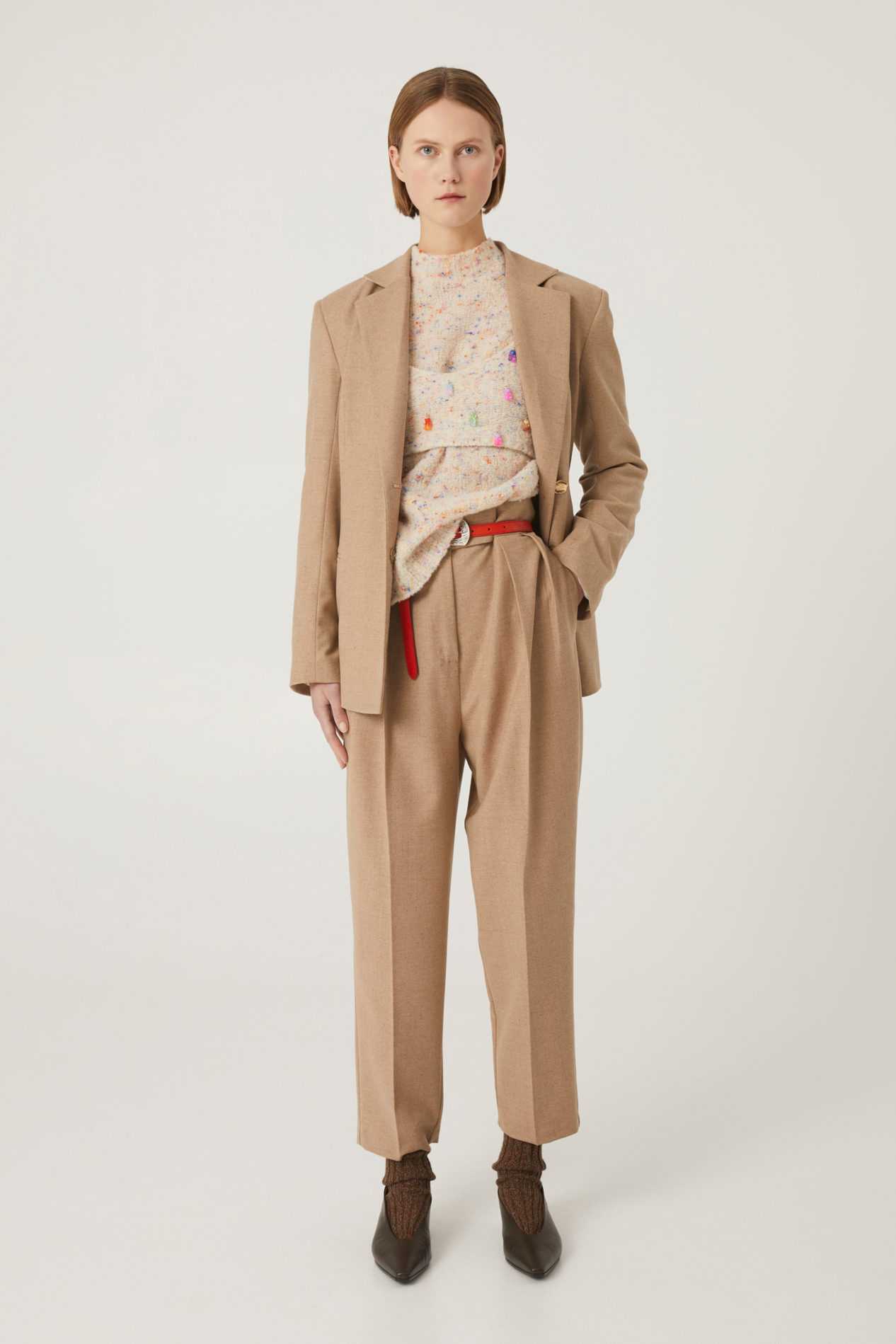 Модницам из деловой сферы стоит иметь ввиду, что дизайнеры сделали хитом сезона черный брючный костюм. Для него актуально выбирать свободный крой брюк, укороченный жакет и низкую посадку. В целом костюмы на подиумах были представлены с «мужского плеча», а также с двубортным кроем, брюками-бананами и широким поясом. Стилисты предлагают комбинировать их с модными вязаными или костюмными жилетами. Впрочем, мода на жилетки допускает их носку не только в строгом классическом образе, но и вместе с джинсами, юбками и платьями.