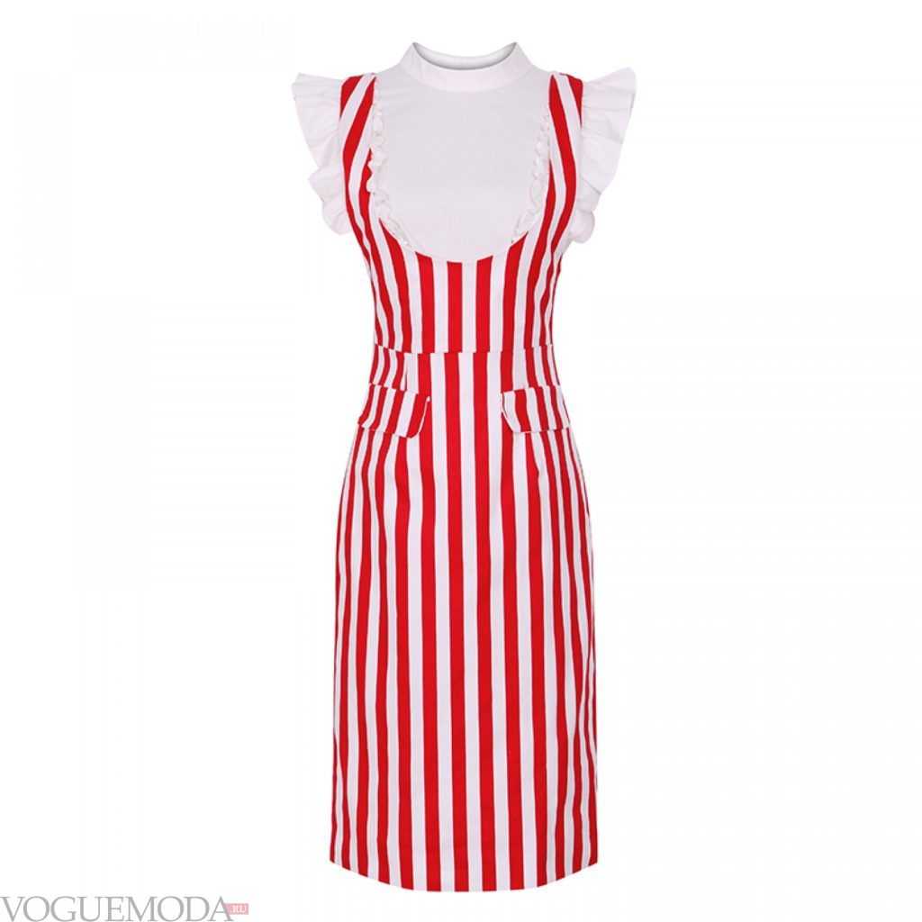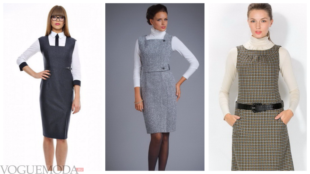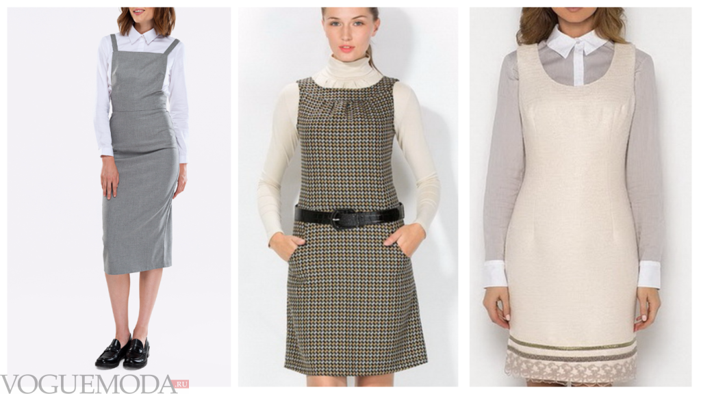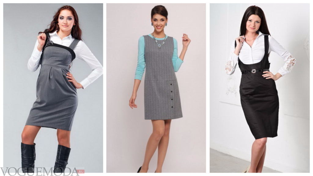 - Платье-сарафан. Этот вариант один из самых практичных, ведь он совсем не сковывает движения. Его можно комбинировать с рубашкой, блузой, водолазкой. Дополнить сарафан можно стильным ремешком. Крой может быть прямым, расклешенным, без рукавов, на бретелях.