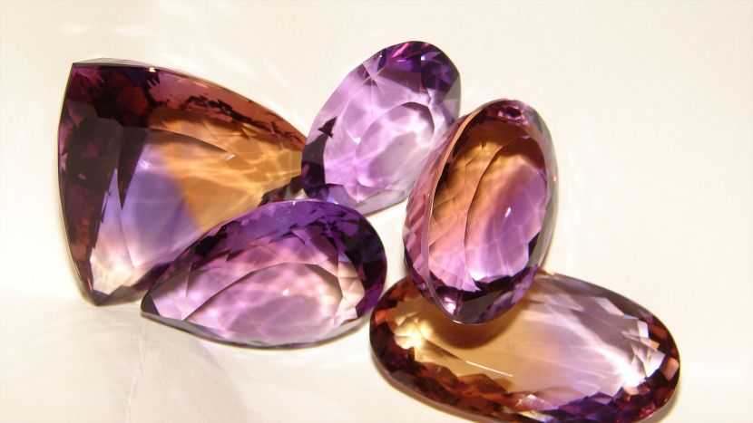 по описанию напоминает аметист и цитрин, за что и было, в принципе, дано такое название. Цвет варьируется от лилового до персикового. Больше всего такие минералы добывают на территории Боливии. Изделия, поступающие именно оттуда, считаются самыми качественными. Отличительная особенность заключается в ярком и насыщенном оттенке. Аметрин хорошо смотрится с серебром, золотом. Можно использовать отдельно либо совместно с другими самоцветами.