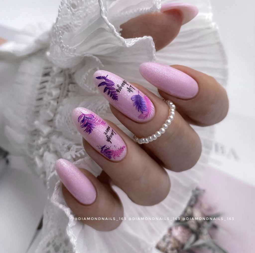 Миндалевидная форма ноготков — классика. Здесь уместны все оттенки сиреневого: от максимально светлых до темных, практически черных. На миндальной форме эффектно смотрится маникюр “кошачий глаз”, вертикальное омбре, необычный френч.
