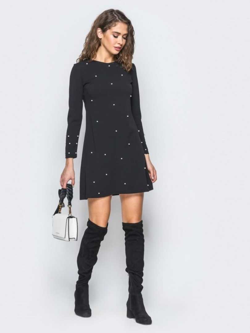 Если вы не хотите надевать колготки, можете предпочесть высокие сапоги или ботфорты. При достаточной длине их будет скрывать подол платья. При желании повысить градус эффектности этого лука, можно выбрать бархатную обувь – она стильно контрастирует с пайетками.