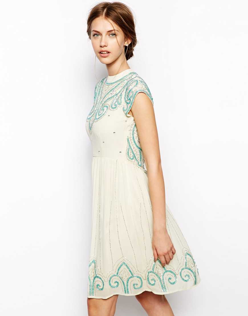 Яркие элементы декора подходят для нарядов пастельных тонов. Для вечернего платье допускается использовать большое количество бисера и бусин.