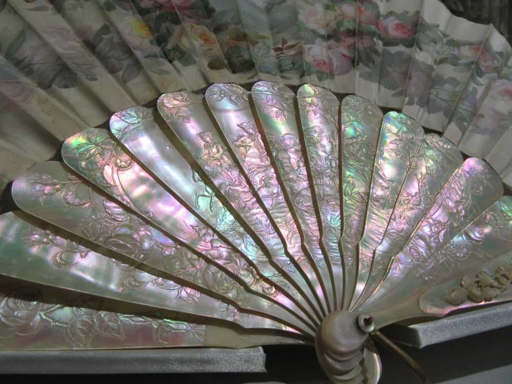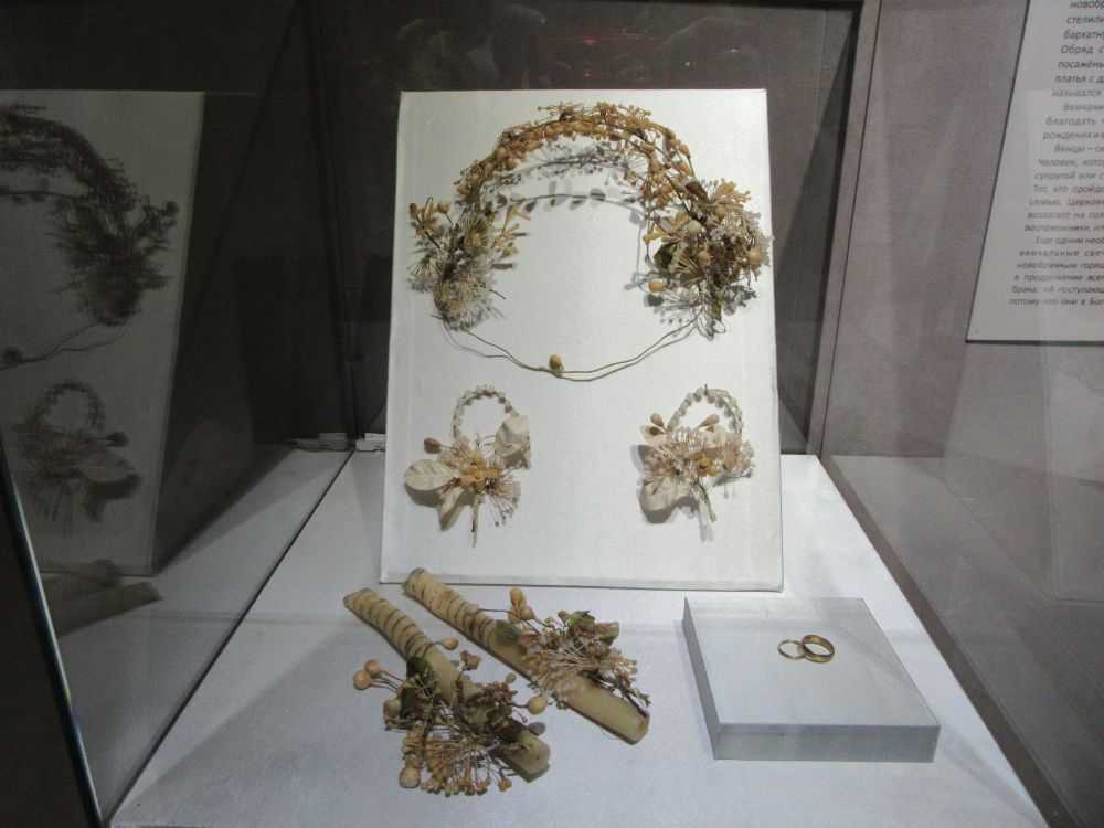 Кроме фаты, в XIX веке были и другие свадебные аксессуары. Один из них — перламутровый веер, на котором вырезаны скачущие всадники. Подобный находится в собрании Эрмитажа – он был изготовлен к свадьбе великой княжны Марии Александровны с герцогом Эдинбургским, которая состоялась в 1874 году в Петербурге. На выставке в Коломенском представлен практически такой же веер, только на нем изображен один голубь вместо двух. Возможно, аксессуар был сделан к свадьбе кого-то из царственной семьи.