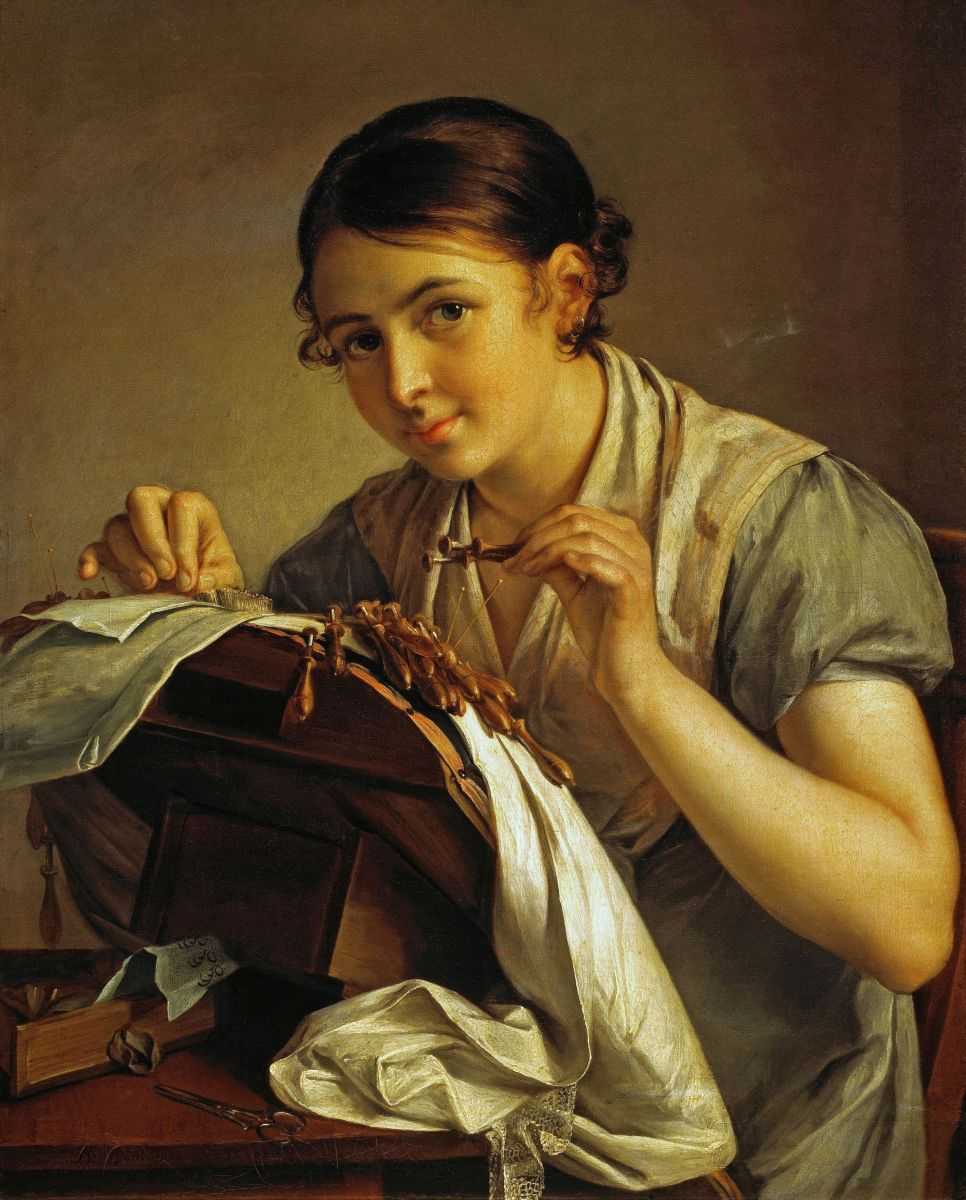 Кружева плели специальными приспособлениями — коклюшками. На портрете «Кружевницы» Тропинина изображены французские коклюшки, поскольку, скорее всего, кружевница работала у дворян. Из российских кружев мы знаем только вологодское, хотя было много центров кружевоплетения. Даже если наши кружевницы делали тонкое красивое кружево, его все равно клали в коробку из-под французского и выдавали за зарубежное — считалось, что оно лучше российского.