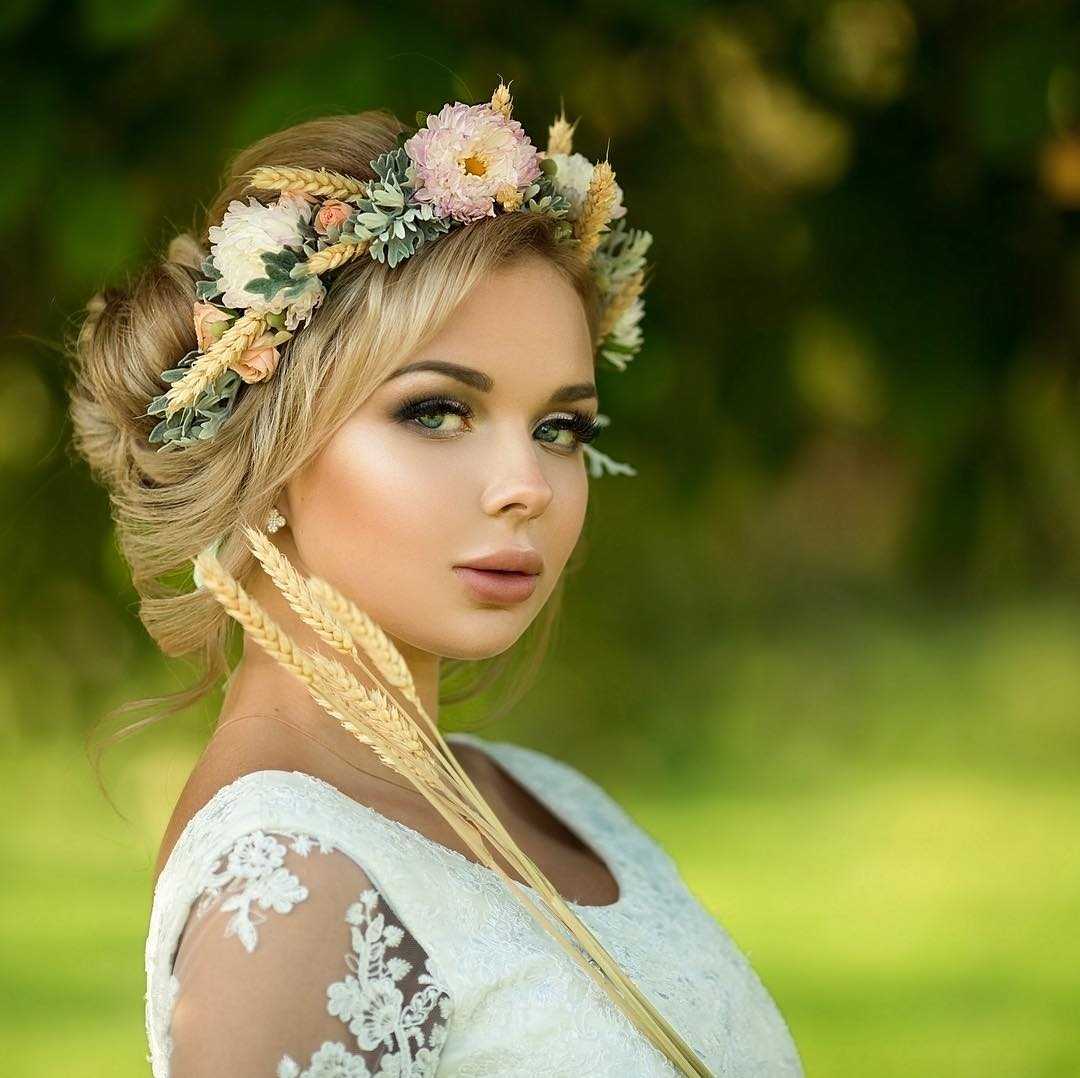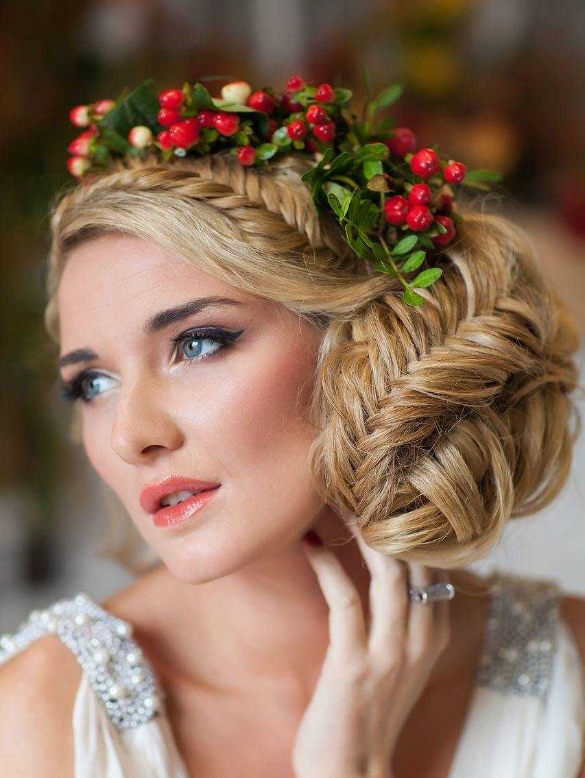 Русские свадьбы всегда отличались характерными яркими красками и захватывающими длительными обрядами, которые сопровождались шумными и весёлыми торжествами. Повышенное внимания уделялось каждой детали, и создание причёски для новобрачной уделялось немало времени. Зачастую это были разнообразные плетения из кос, которые украшались венками из живых цветов, яркими, в основном красными, лентами или кокошником, выполненным в цветах общего наряда молодожёнов. Такие головные уборы мастерицы красиво расшивали узорами. Современные свадебные причёски в русской стилистике конечно отличаются от своих предков раскованностью, но всё также представляют собой потрясающие укладки с венками, цветами, лентами и кокошниками, которые украшают волосы невесты.
