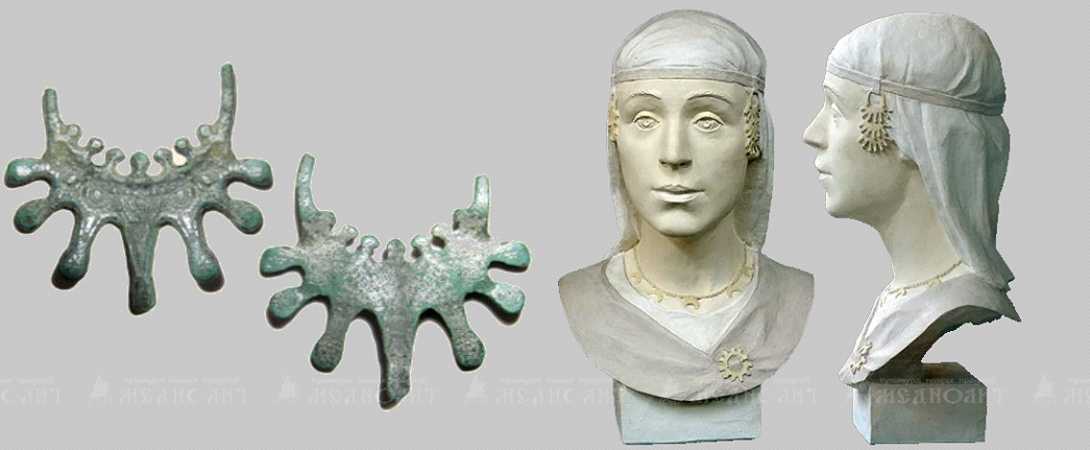 Отдельный вопрос в теме о головных уборах – это височные кольца, являющиеся важным атрибутом женской одежды. По мнению М.А. Сабуровой, существовало три способа ношения височных колец, что удалось установить по материалам археологических работ в Вологде: вплетенные в косу; продетые в ткань головного убора; носившиеся непосредственно в ушах. Ранее А.В. Арциховским было установлено, что иногда кольца продевались в повязку на голове. Имеются сведения, что для прикрепления височных колец использовались золототканые ленты.