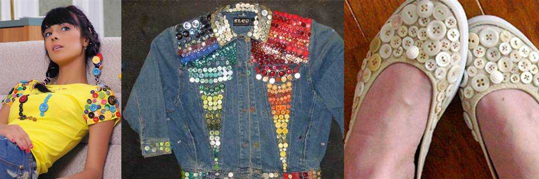 Пуговицы пришивают или приклеивают. Перед тем как пришивать пуговицы, разложите их на ткань и «примерьтесь». Подберите одинаковые пуговицы или, если хотите разноцветный декор, покрасьте их акриловой краской. Можно нанести клей на пуговицу, затем расписать ее блестками или приклеить стразы. В детской одежде рукодельницы используют пуговички в виде зверушек, цветочков, лапок, карандашей и др. Количество отверстий пуговиц может варьироваться. Пуговица может быть в тон основного материала украшаемой вещи, неприметная или наоборот контрастная по цвету.
