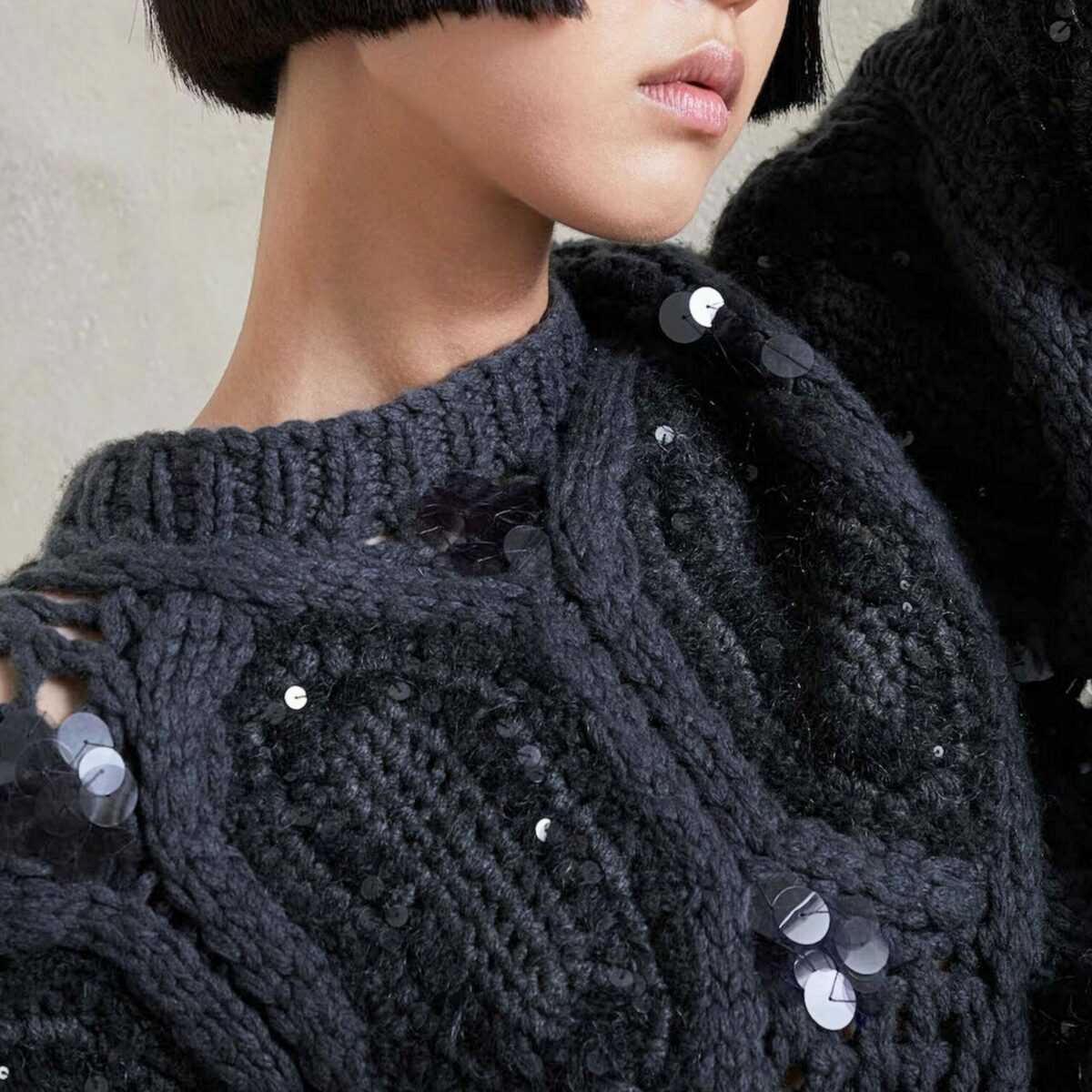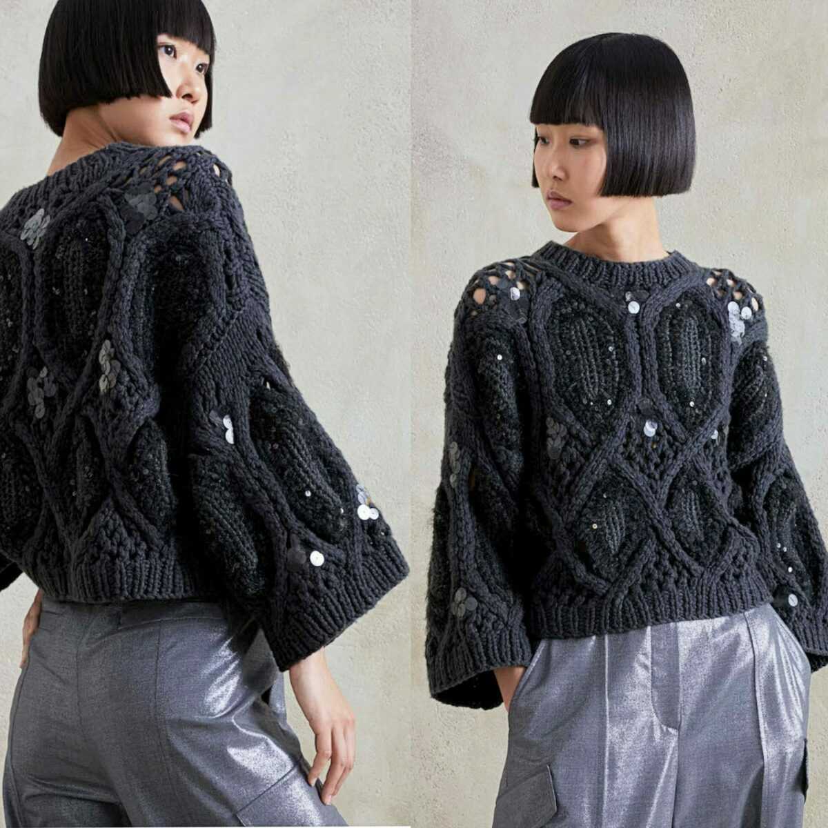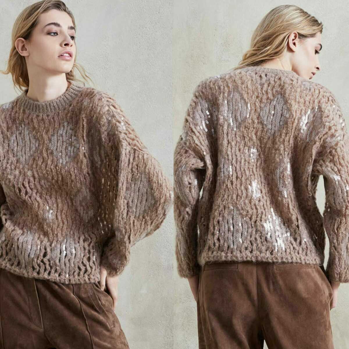 Теперь же пайетки — это, можно сказать, главная фишка короля трикотажа! Конечно, не только они. Не меньшую роль играет грамотно подобранная пряжа, фасон и оригинальный узор. Последнее для Кучинелли тоже не проблема!