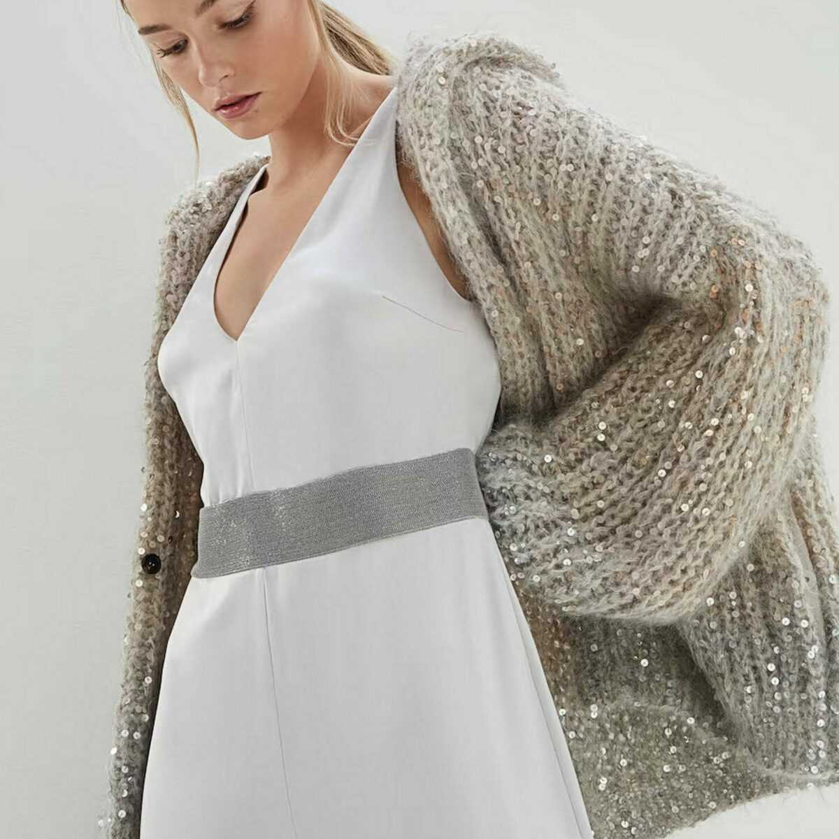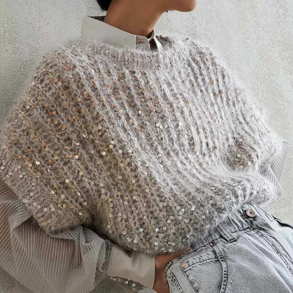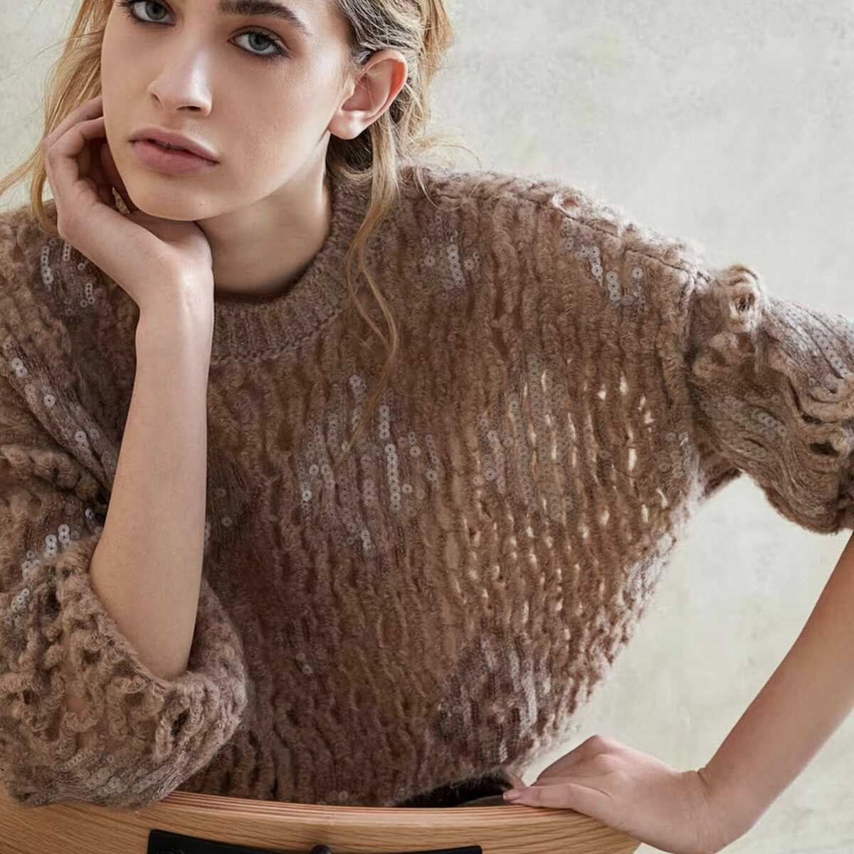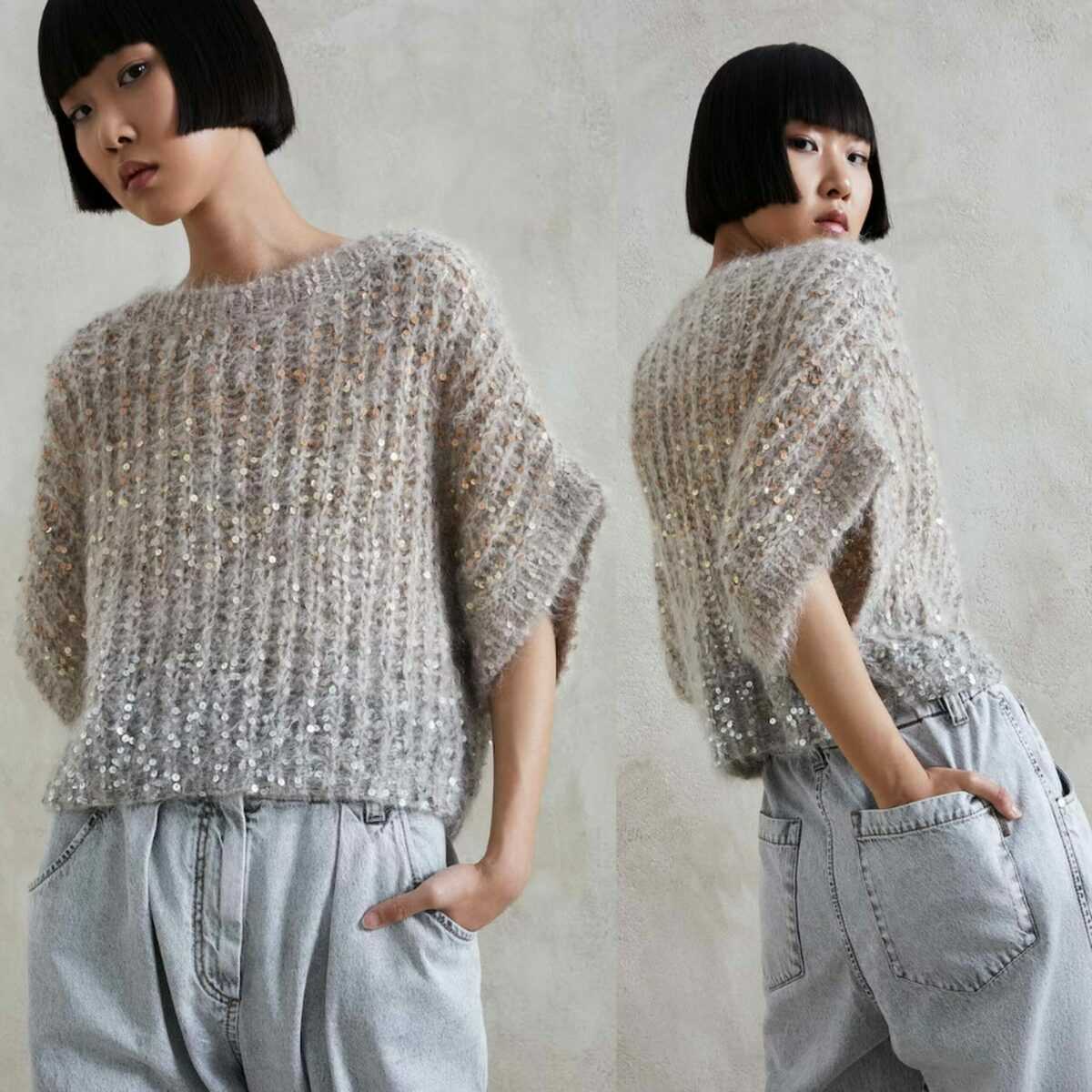 Теперь же пайетки — это, можно сказать, главная фишка короля трикотажа! Конечно, не только они. Не меньшую роль играет грамотно подобранная пряжа, фасон и оригинальный узор. Последнее для Кучинелли тоже не проблема!