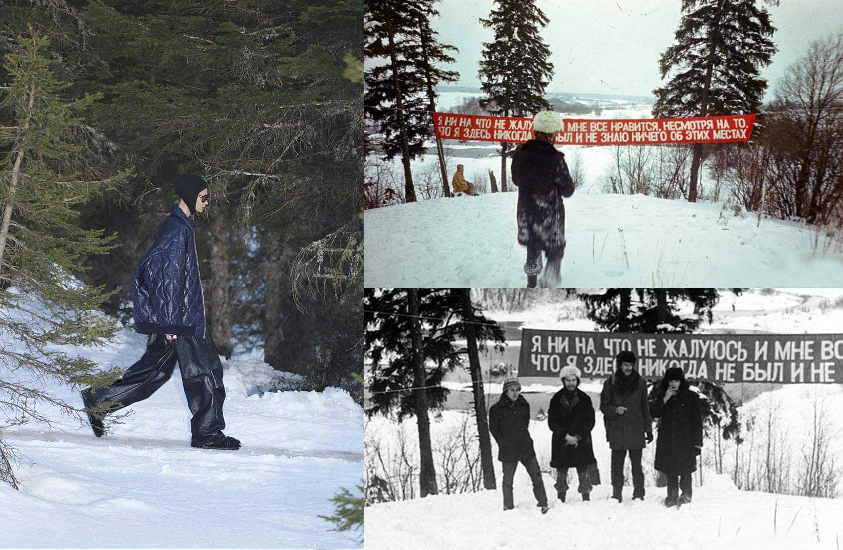 Стеганые куртки, шапки-шлемы, бадлоны и водолазки на фоне заснеженного леса. Что это? Шоу Miu Miu, лукбук Dsquared2 или советский акционизм? В 1976 году московские концептуалисты основали группу «Коллективные действия». Акции на природе художники документировали с помощью фотографий. На них попадаются люди, одетые адекватно эпохе и погоде. Впрочем, если сделать монтаж и поместить, скажем, девушку в Tod’s в кадр, вряд ли кто-то быстро заметит подмену. Вот и идея для новой акции. Виртуальной, как и положено в эпоху пандемии.