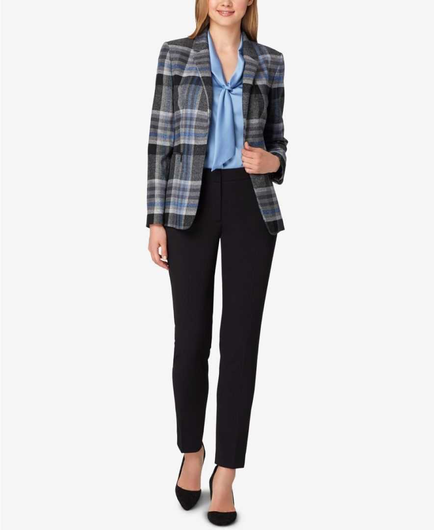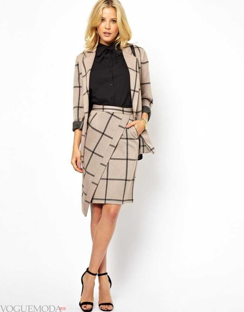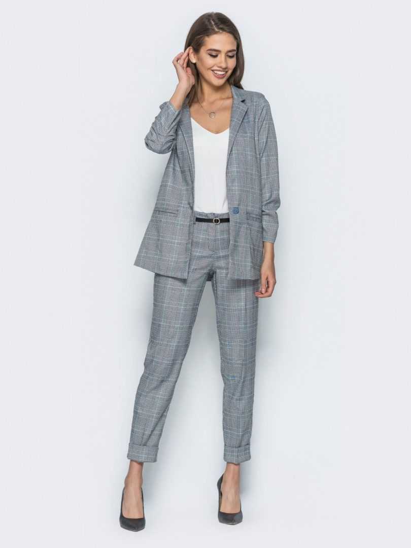 Но модель, которая полностью сшита из клетчатого полотна будет выглядеть слишком пестрой. Поэтому лучше выбрать комплект, в котором из клетчатой ткани сшит только жакет, а нижняя часть выполнена из однотонной ткани.