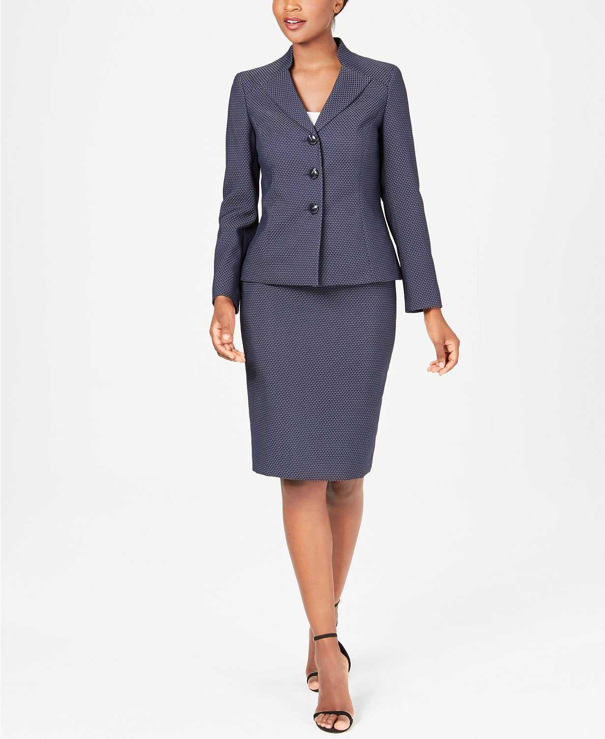 Что же касается расцветки, классический костюм может быть черным, темно-синим, серым, изумрудным, винным, а также иметь узор: клетка, полоска или горошек допустимы в деловом стиле.