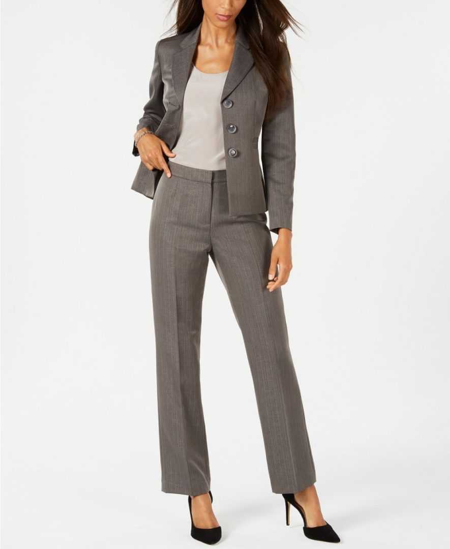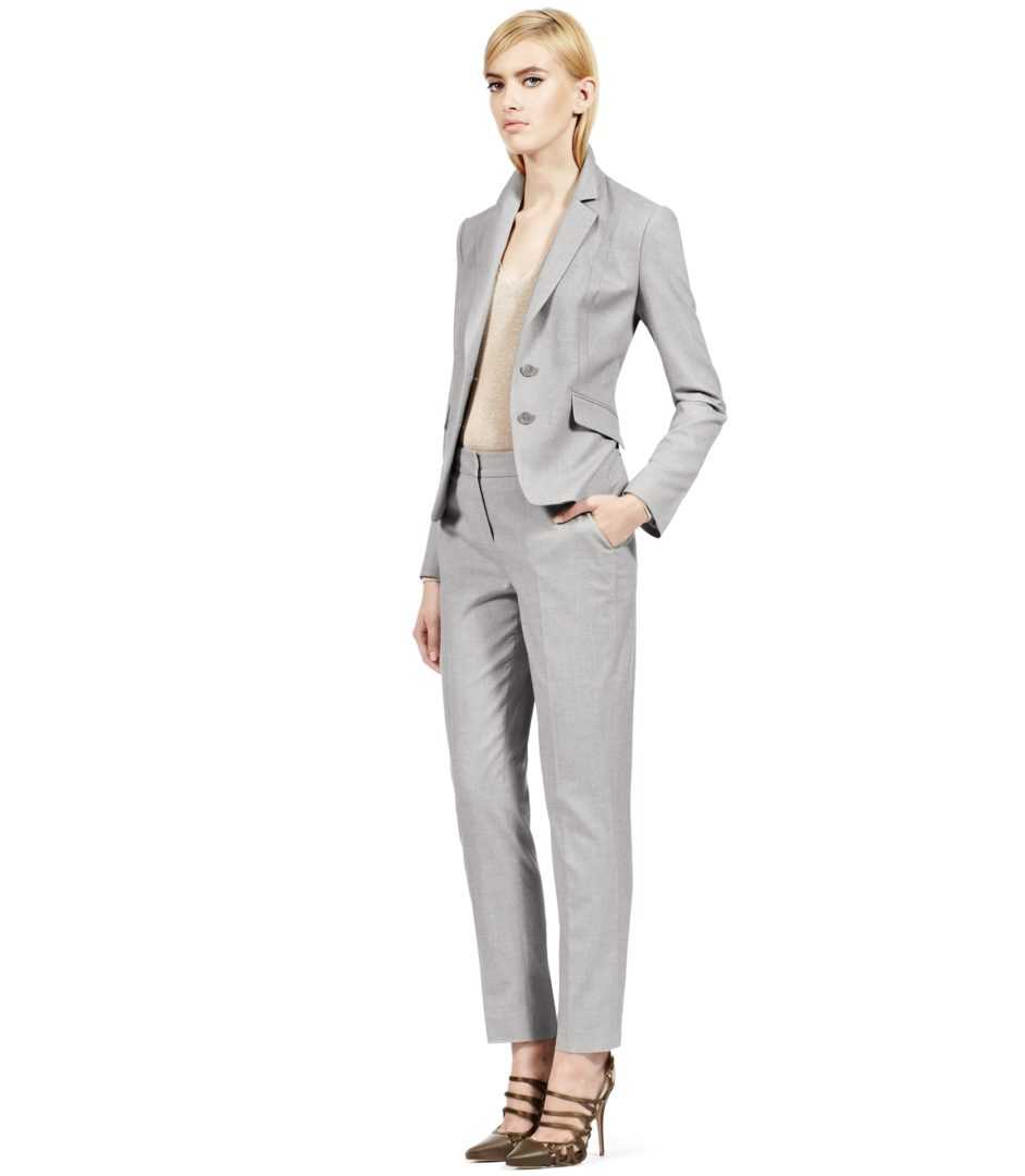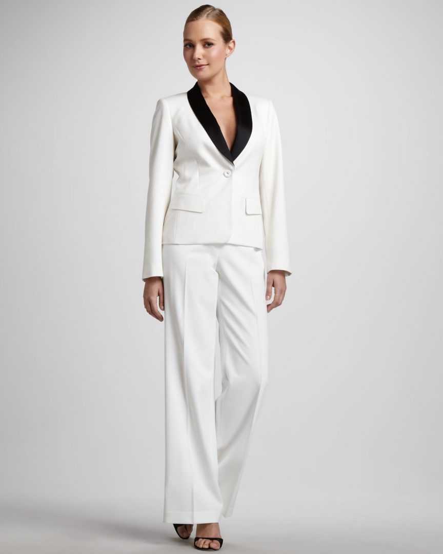 Цвет. Для работы лучше всего, приобрести вещь нейтральной расцветки. Зимой хорошо будет смотреться черный, темно синий или темно зеленый костюм. Летом можно выбрать модель пастельной расцветки. Идеальным выбором является серый цвет, зимний костюм может быть темно-серым, а летний – светлого оттенка этого нейтрального цвета. А вот белый брючный костюм в строгий дресс-код не вписывается. Зато это отличная вещь для любого торжества, за исключением свадьбы, конечно, если модница не является невестой.