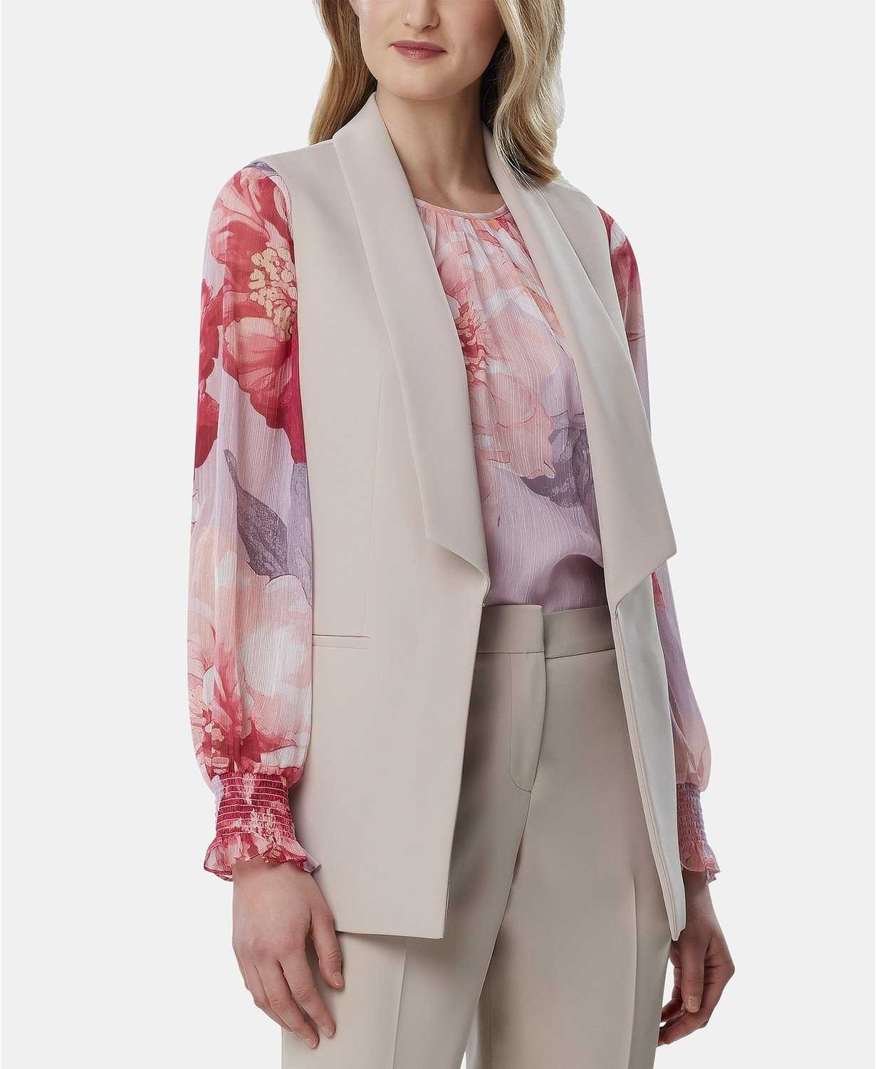 Верх делового костюма может быть разным. Обычно это классический пиджак с отложными однобортным или двубортным воротником и двумя карманами-обманками или жилетка, которая может быть укороченной, средней длины или удлиненной. Костюмы-тройки состоят из брюк, жилетки и пиджака.