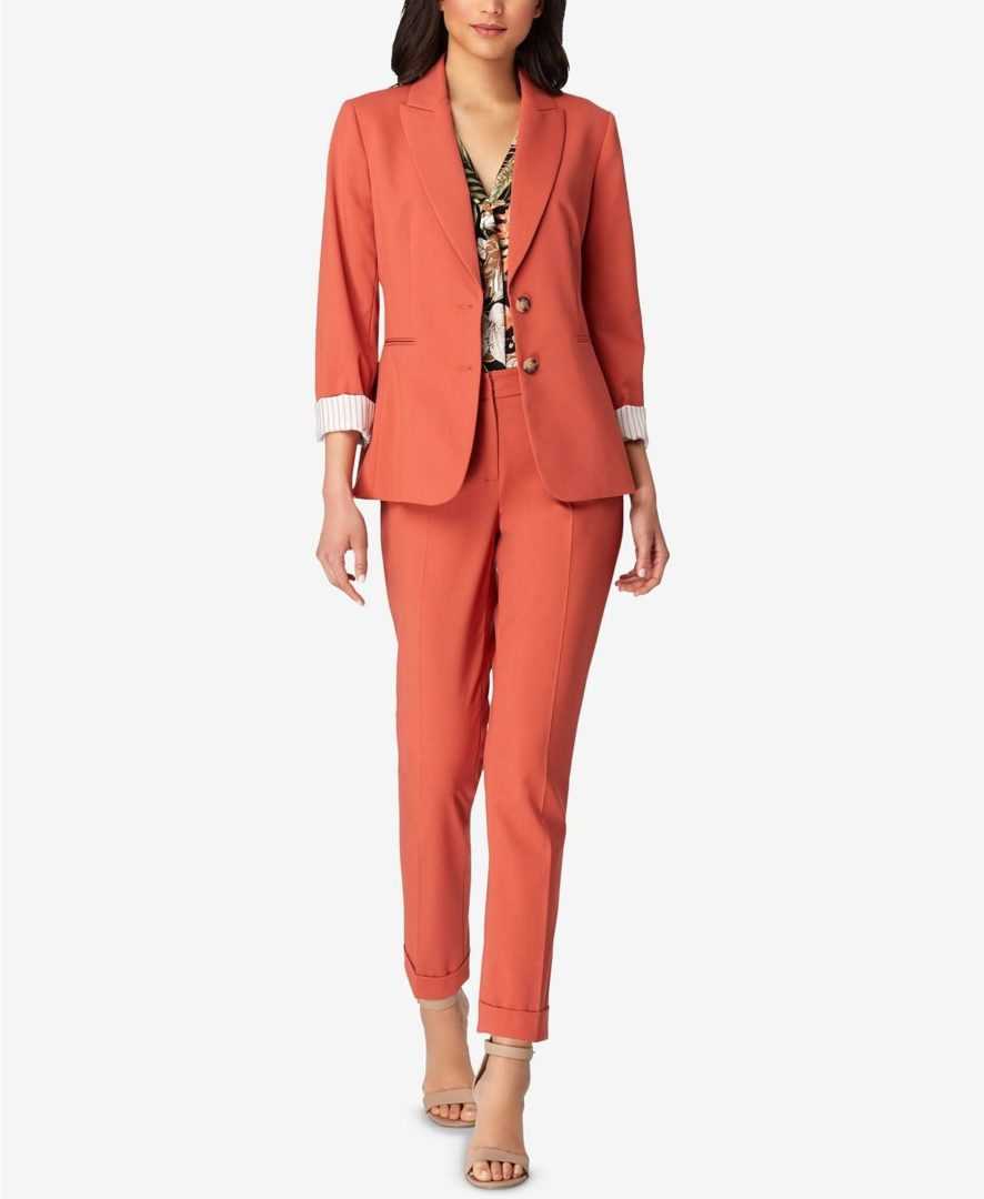 Пиджак лучше всего подбирать в тон, дабы получить эффект именно костюма, а не сборной солянки, но для любительниц экспериментов, а также тех, кто устал от однотонности такой выход будет как нельзя кстати. В этом случае все зависит от вашего настроения. Фасон жакета тоже может сыграть немалую роль в создании очень женственного образа. К примеру однобортный пиджак с фигурным вырезом до самых пуговиц может добавить плавности всему силуэту