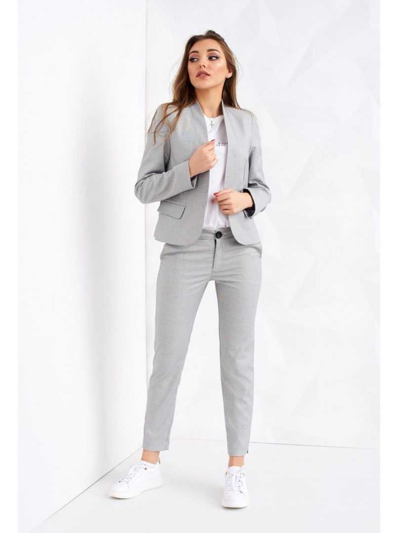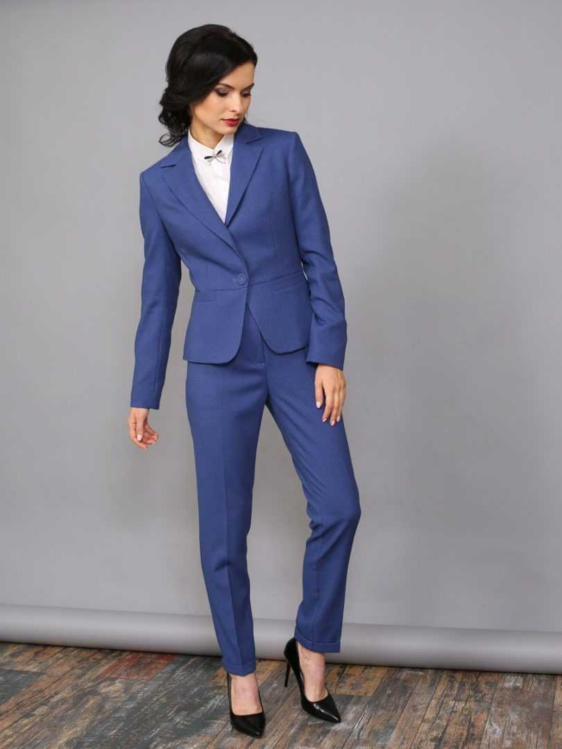 Широкие брюки. Такие костюмы подходят всем, независимо от фигуры. Их можно носить с блузками, рубашками, для того, чтобы создать строгий образ. Для повседневного ношения можно надеть свитер или топ. Клеш. Этот вид брюк носили еще наши мамы, и сегодня они опять в моде. Высокая талия и каблуки визуально сделают силуэт тоньше. Облегающий верх и пиджак, получается современный лук. Кюлоты. Широкие укороченные штаны и легкий пиджак подойдут для жаркой погоды. В таком костюме будет легко и комфортно. В офис лучше такой вид костюма не надевать. Узкие брюки. В этом сезоне новинкой являются укороченные зауженные брюки. Короткий пиджак и легкая блузка, элегантный образ готов. Костюм из твида. Такой наряд подойдет для прохладной погоды. Его можно носить и в офис, и на встречу. Лампасы. Этот вид отделки давно закрепился на штанах у модниц. Это классика, которая может быть добавлена к деловому стилю. Вязаный костюм. Это практичная одежда, в которой можно поехать на пикник, или сходить на прогулку. Пижамный тип костюма. Такой костюм закрепился на подиумах не так давно. В нем можно пойти на пляж, прогуляться, сходить на вечеринку. Джинсовые костюмы. Это практичная и удобная одежда. В ней женщина будет выглядеть модно, стильно и современно. Льняной костюм. Этот материал очень хорош для жаркой погоды. Ткань не вызывает аллергии, приятная к телу. Такой костюм подойдет для любого возраста и размера. Костюм из бархата. Смотрится оригинально, очень комфортный и удобный. Костюм серого цвета. Отлично подойдет для офиса. К нему можно подобрать яркий акцент, в виде сумочки, броши или платка. Белый цвет. Это шикарный наряд, но не многие сегодня рискнуть его надеть. Красный