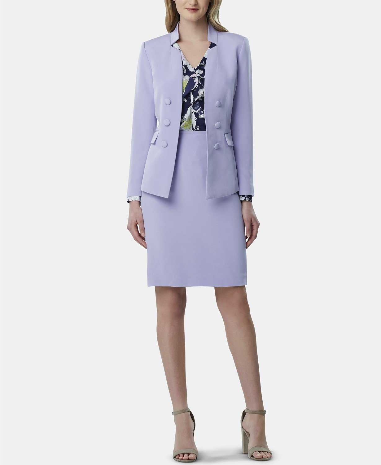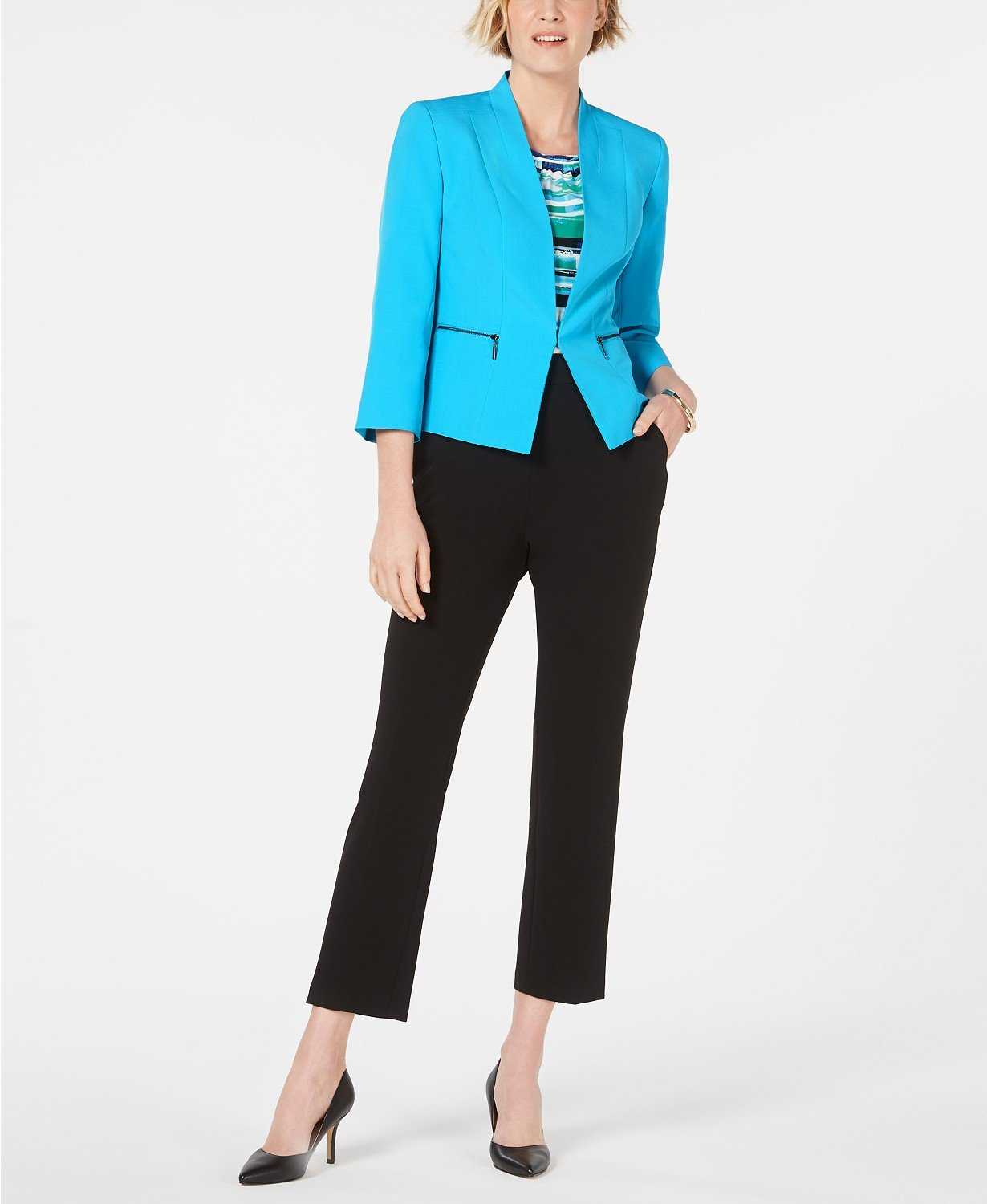 Акцентируя внимание на себя он визуально суживает фигуру, делает ее более грациозной. Под такой женственный жакет можно надеть красивую шелковую блузку контрастного цвета, либо на несколько тонов отличающуюся от цвета всего костюма
