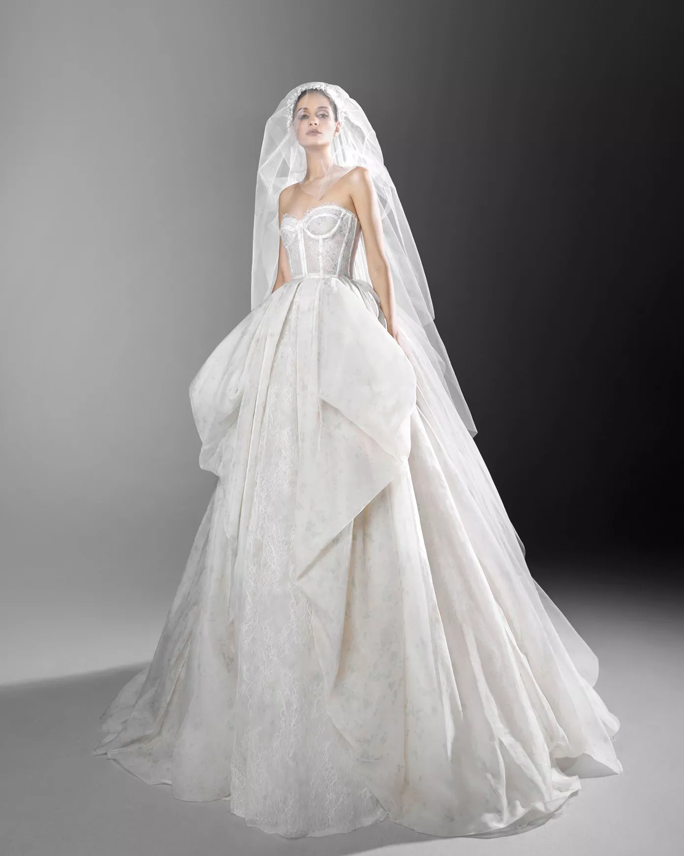 Look 9: Strapless A-line gown with an overskirt.