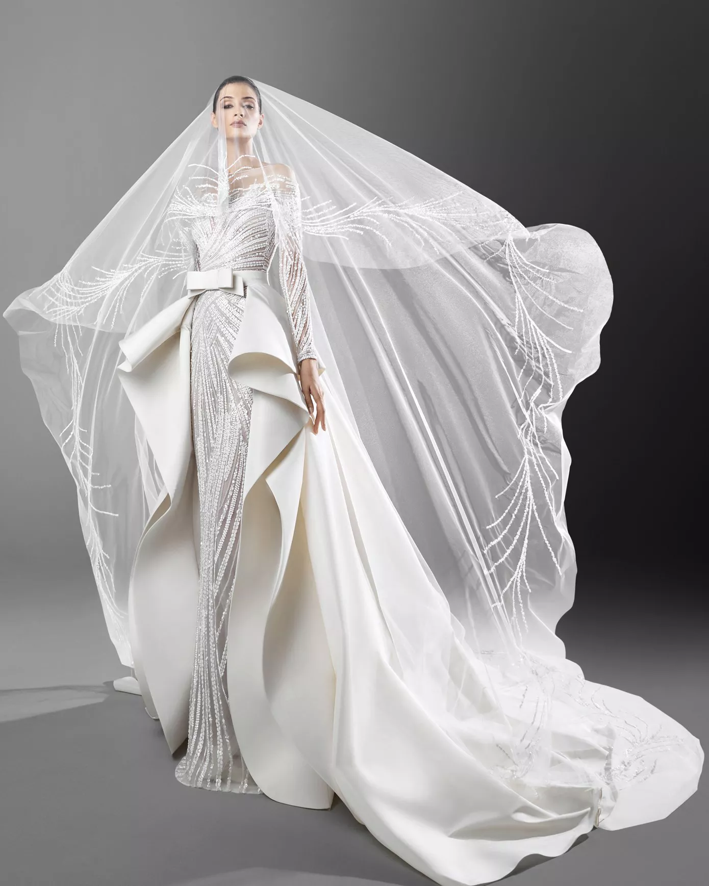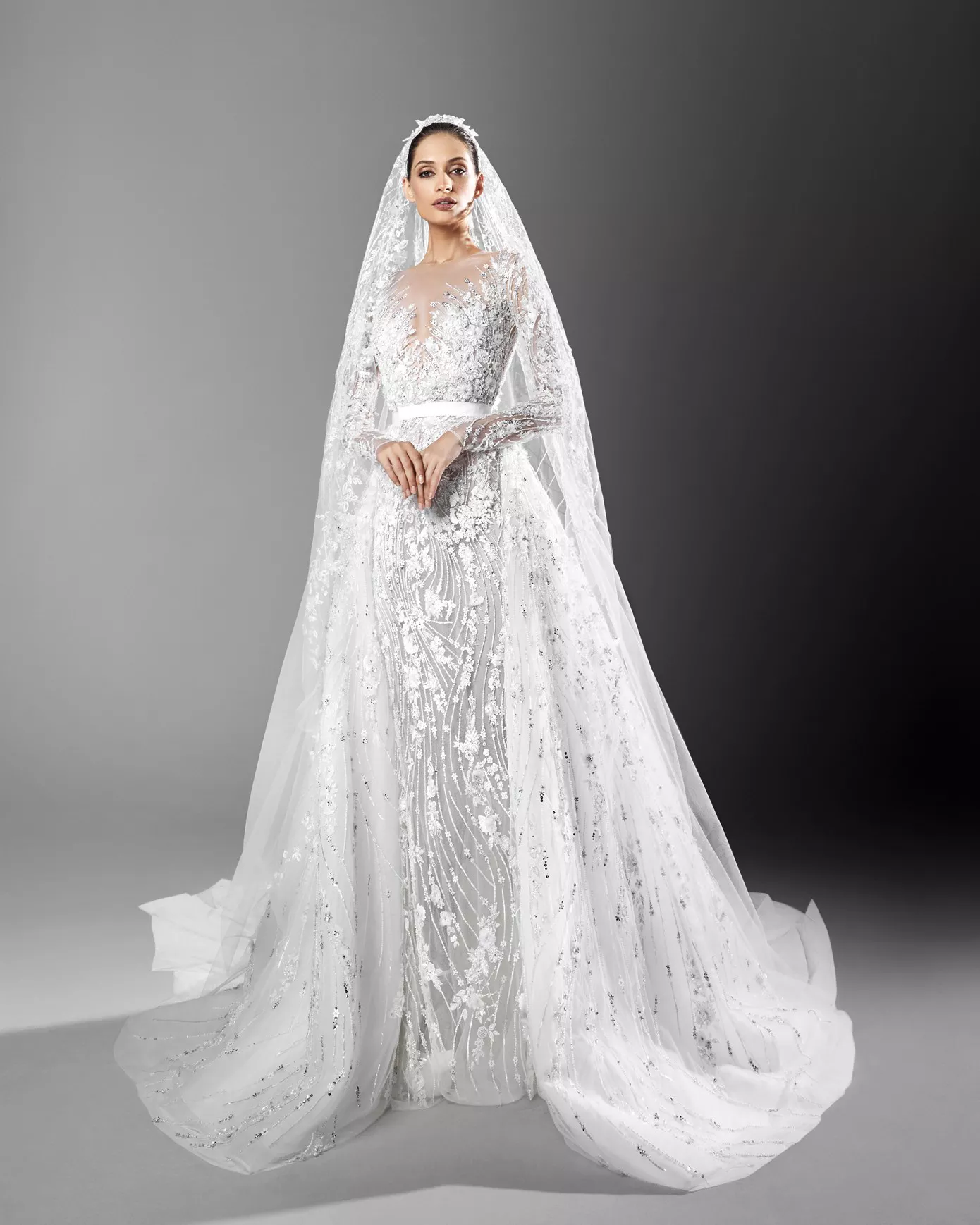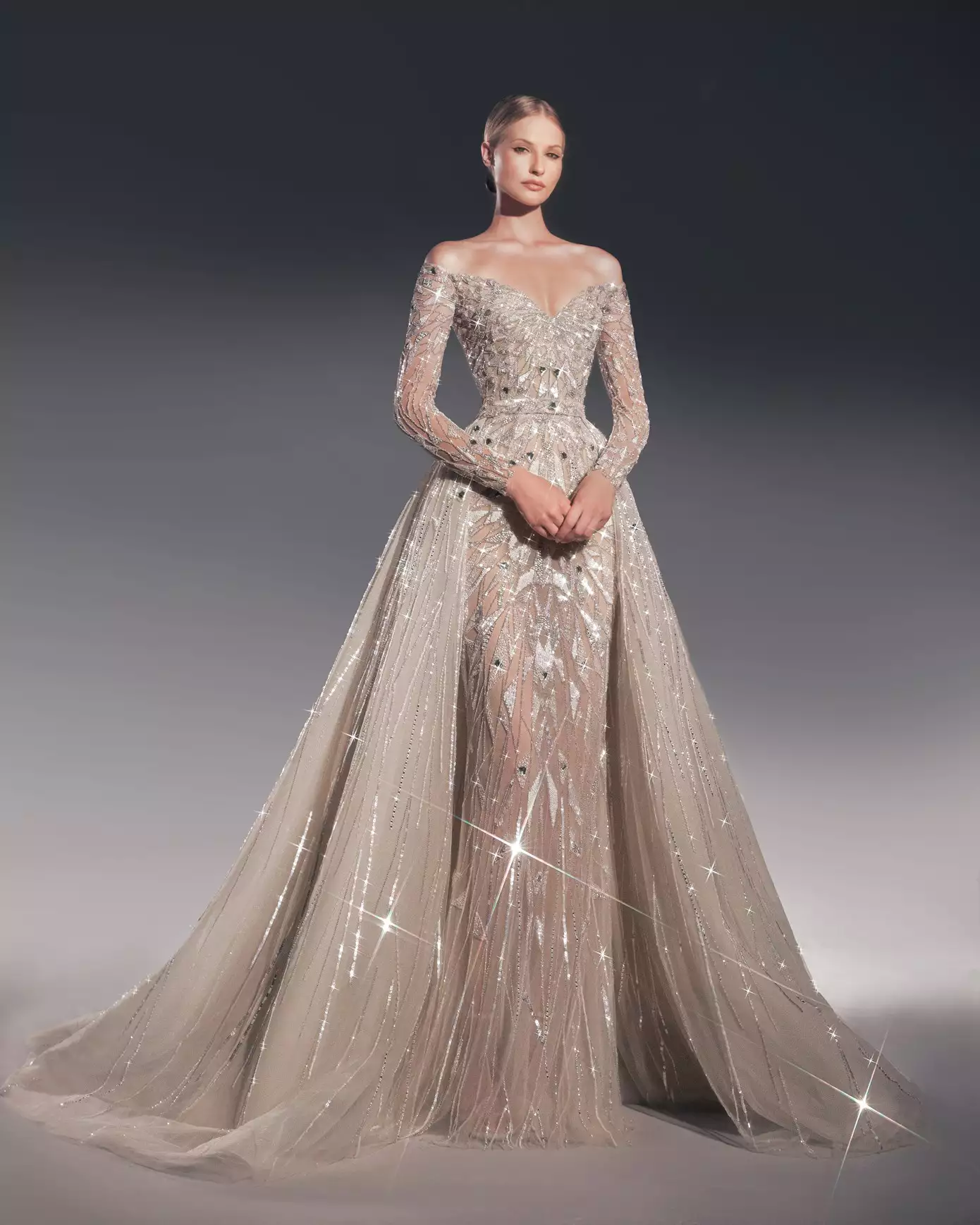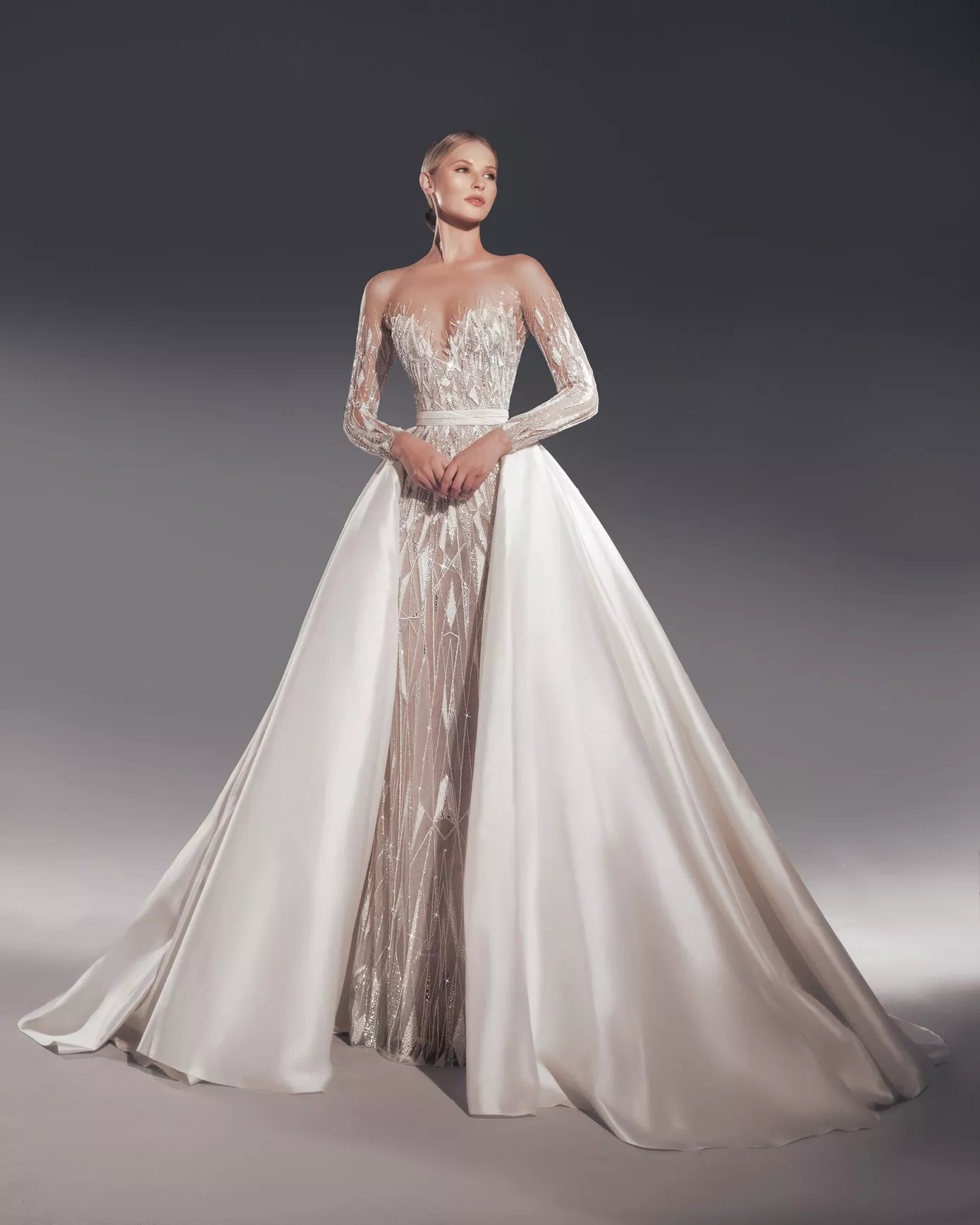 Look 1: Long sleeve crystal-embellished gown with a removable overskirt.