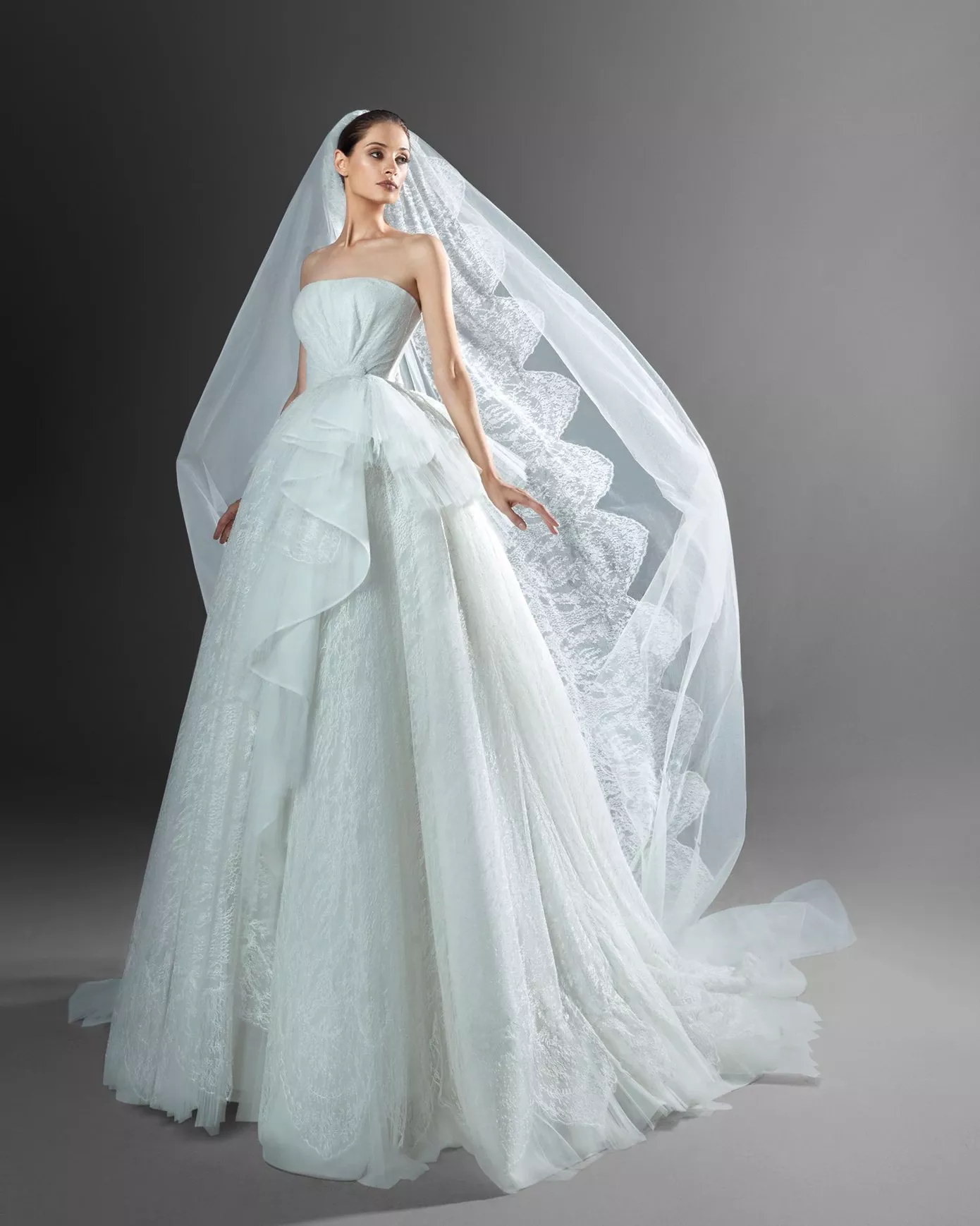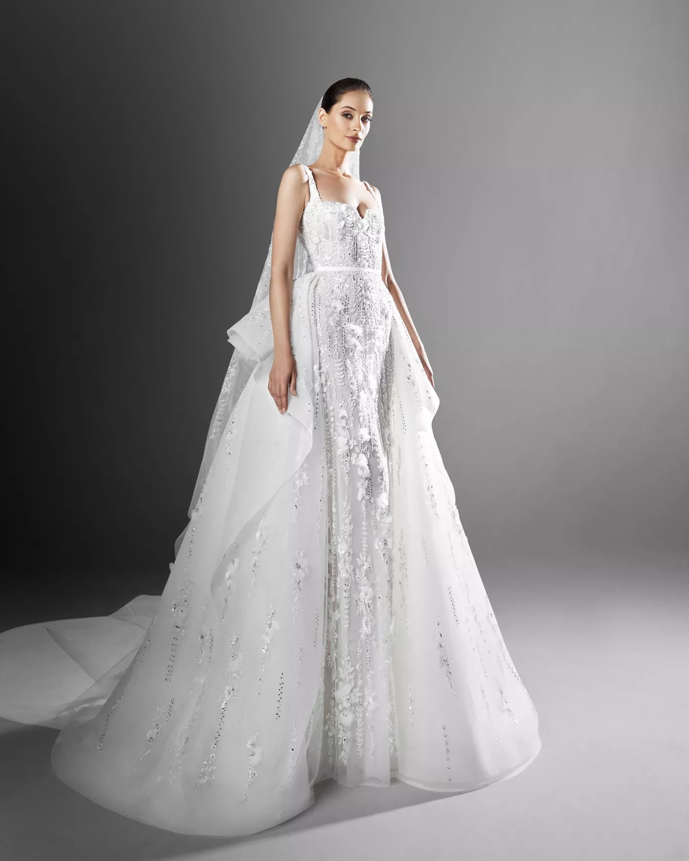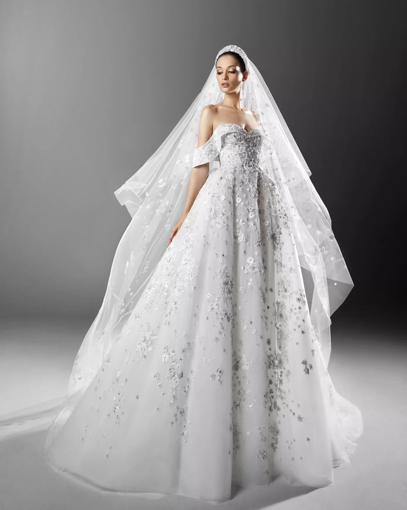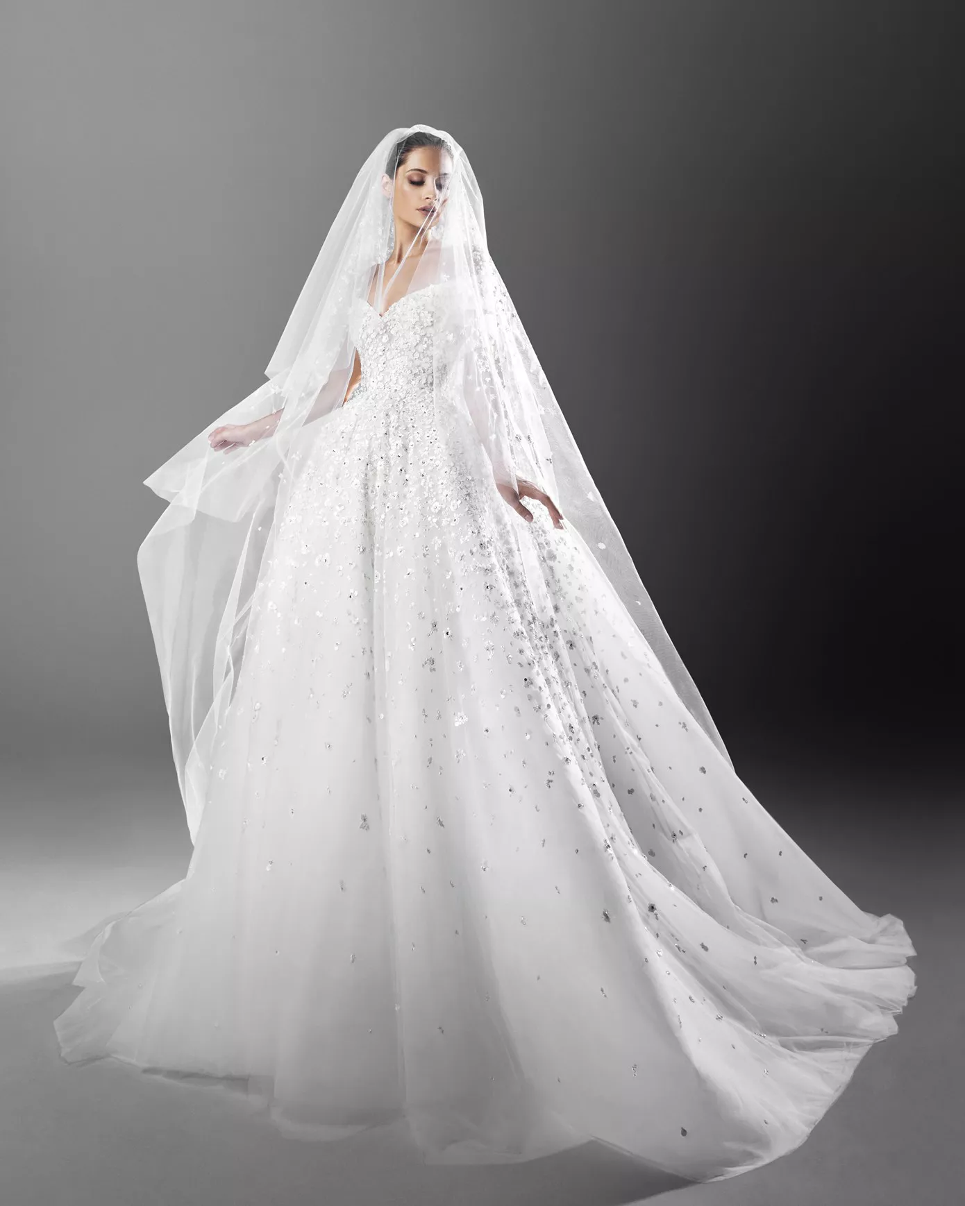 «This Fall-Winter 2022 Collection is bewitching in its singular allure, featuring cabochon-cut stones arranged in a multi-faceted scheme for princess-cut skirts in a magnolia-colored silk tulle, topped with a well-fitted corset cinched at the waist, fully embellished by a delicate blend of sparkling crystals in ecru and silver. The embroidery flirts with its patterns, a medley of sharp angles on the one hand, and a dense crescendo on the other, flaunting the scintillating radiance of the crystal ornaments. Ethereal and effervescent sugar-lace dresses, incandescent and shimmering with a profound amorous charm, immortalize love with arresting lustrous gemstones. The bodices feature square and high collars as well as plunging necklines and bustiers, refining the silhouette and magnifying its allure. Silk taffeta, draped delicately over the bodice boasting a sweetheart neckline, falls to the floor regally for awe-inspiring glamor. Sequins grace the flawless contours of the sheath gown, enveloped in an aura of Mikado silk, the epitome of seduction. The lucid and immaculate collection is purposeful in its celebration of the special day.» — Zuhair Murad