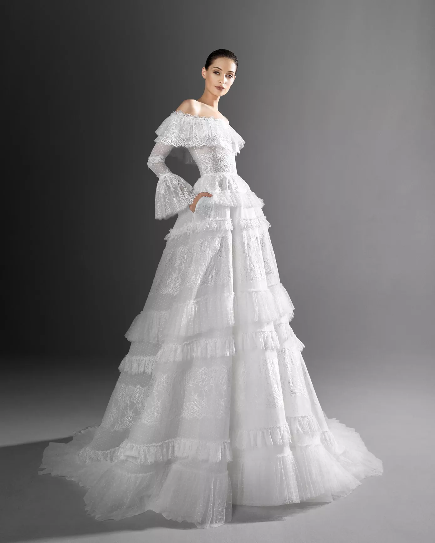Look 7: Ruffled off-the-shoulder ballgown.