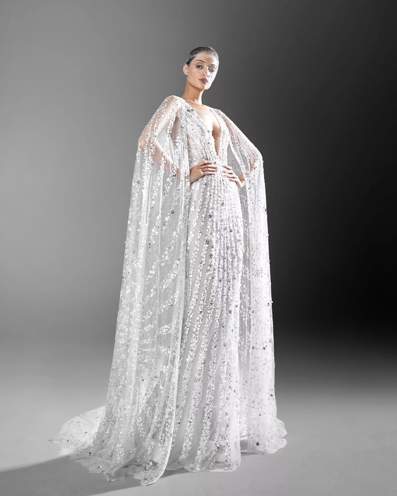 Look 11: Sequin form fitting gown with a removable cape.
