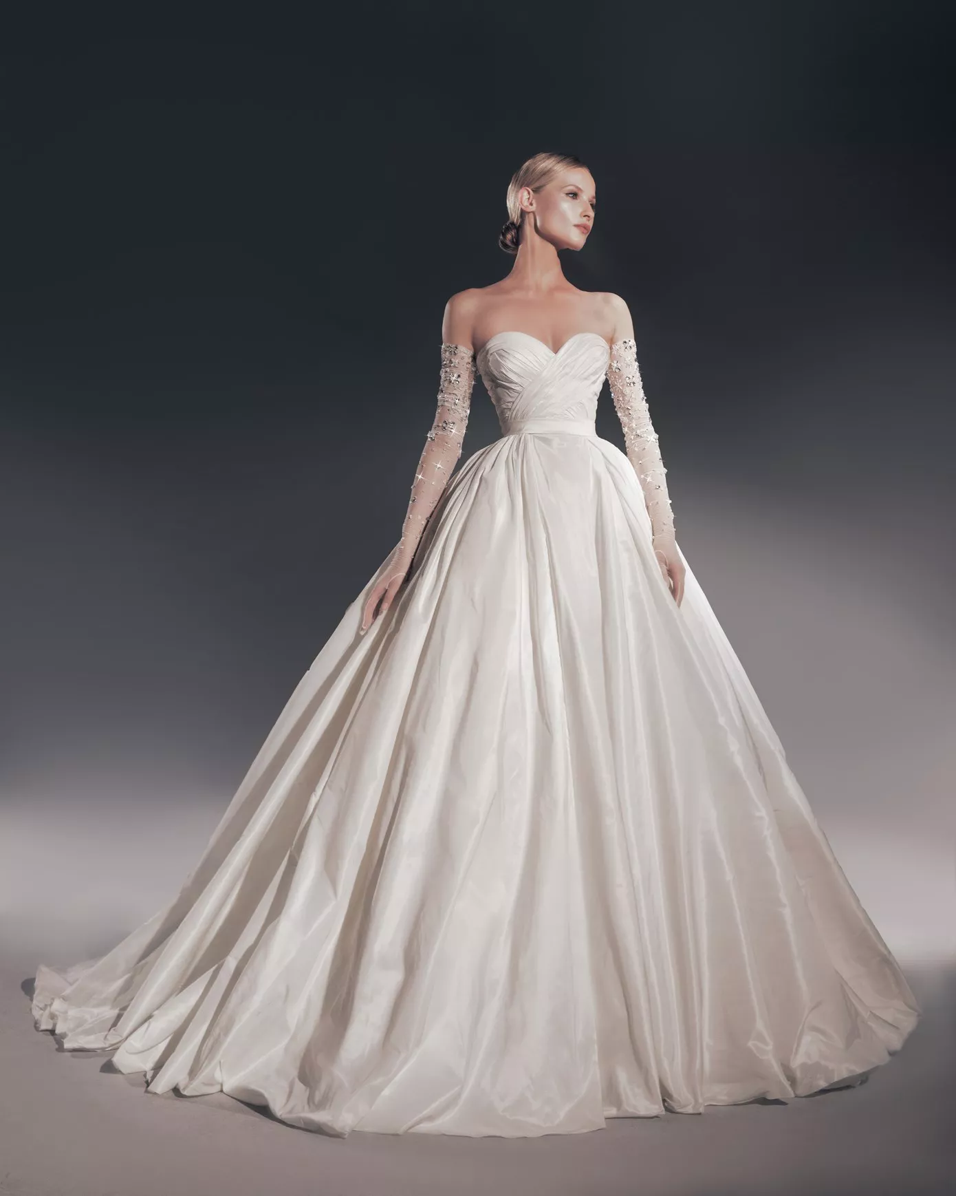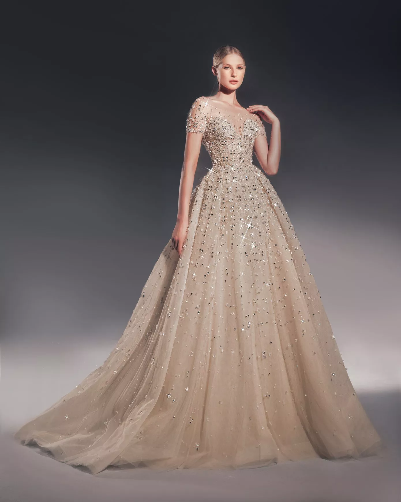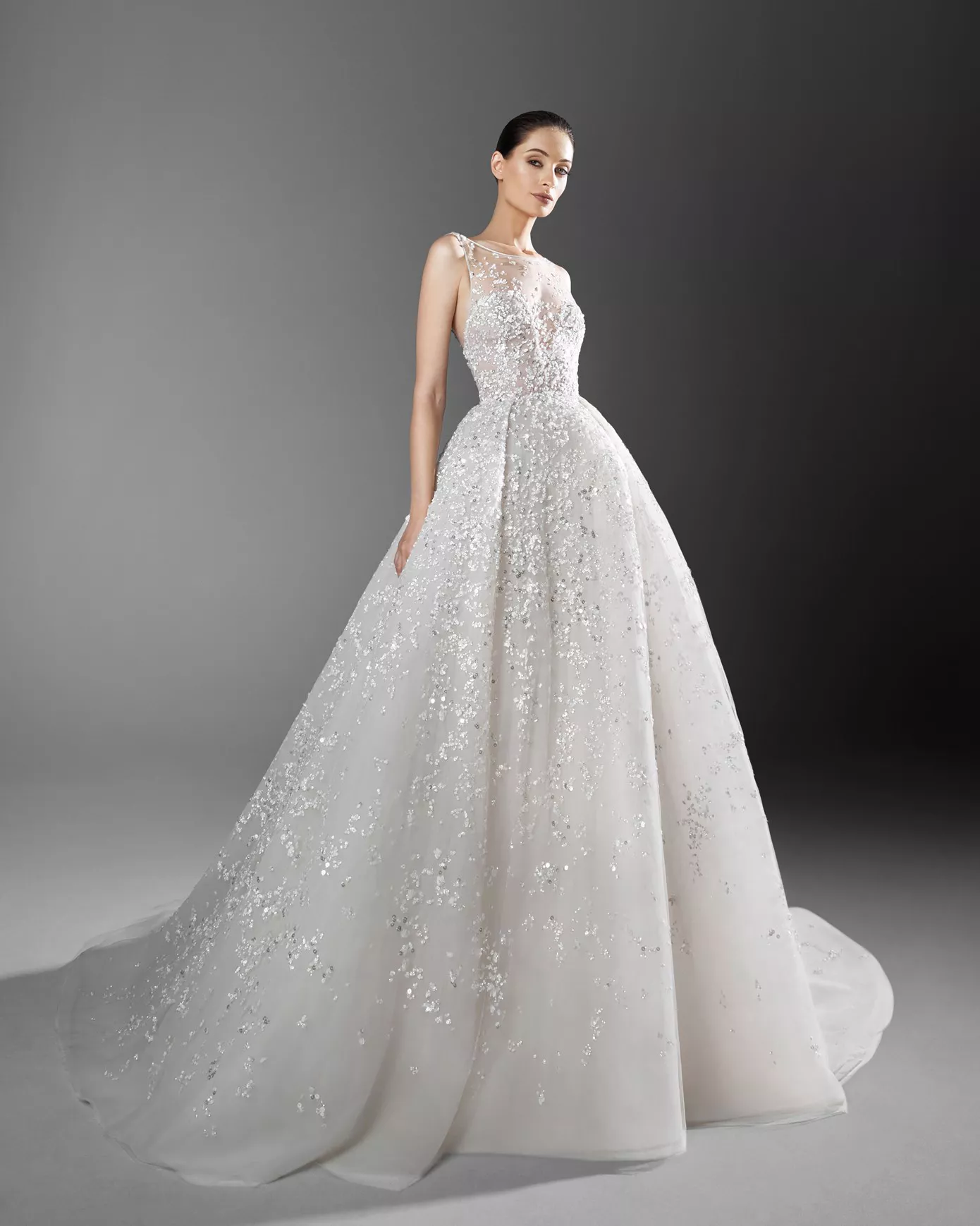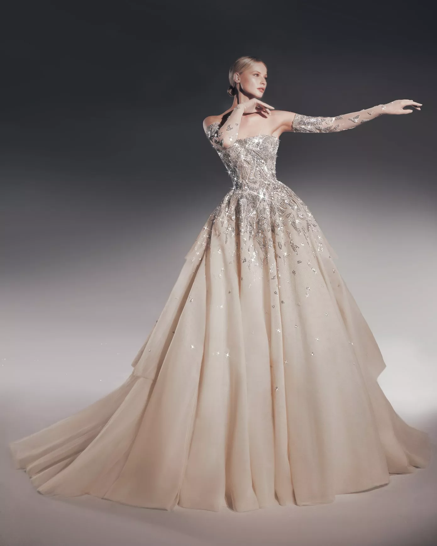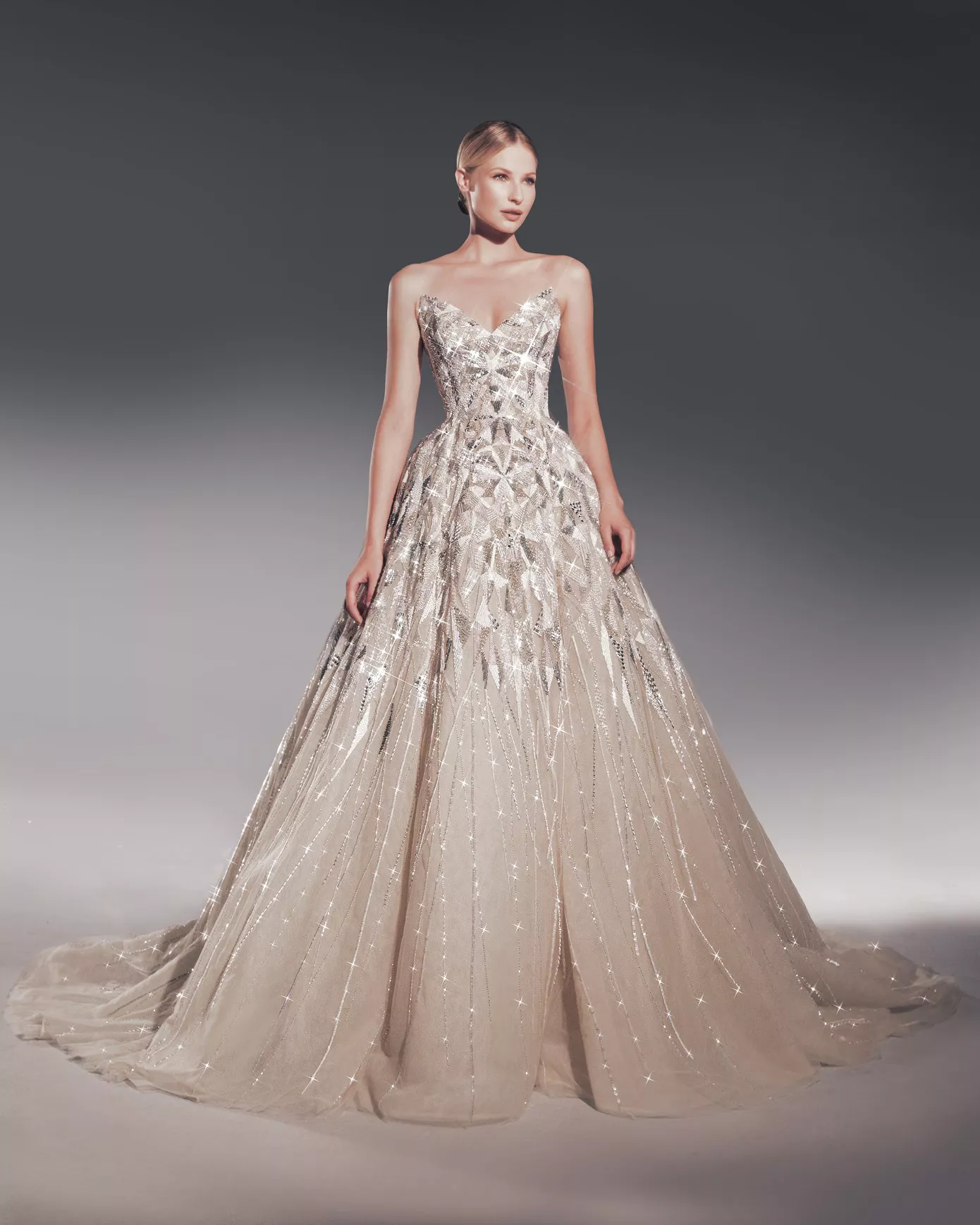 Look 2: A-line ballgown sequin and crystal-embellished gown.